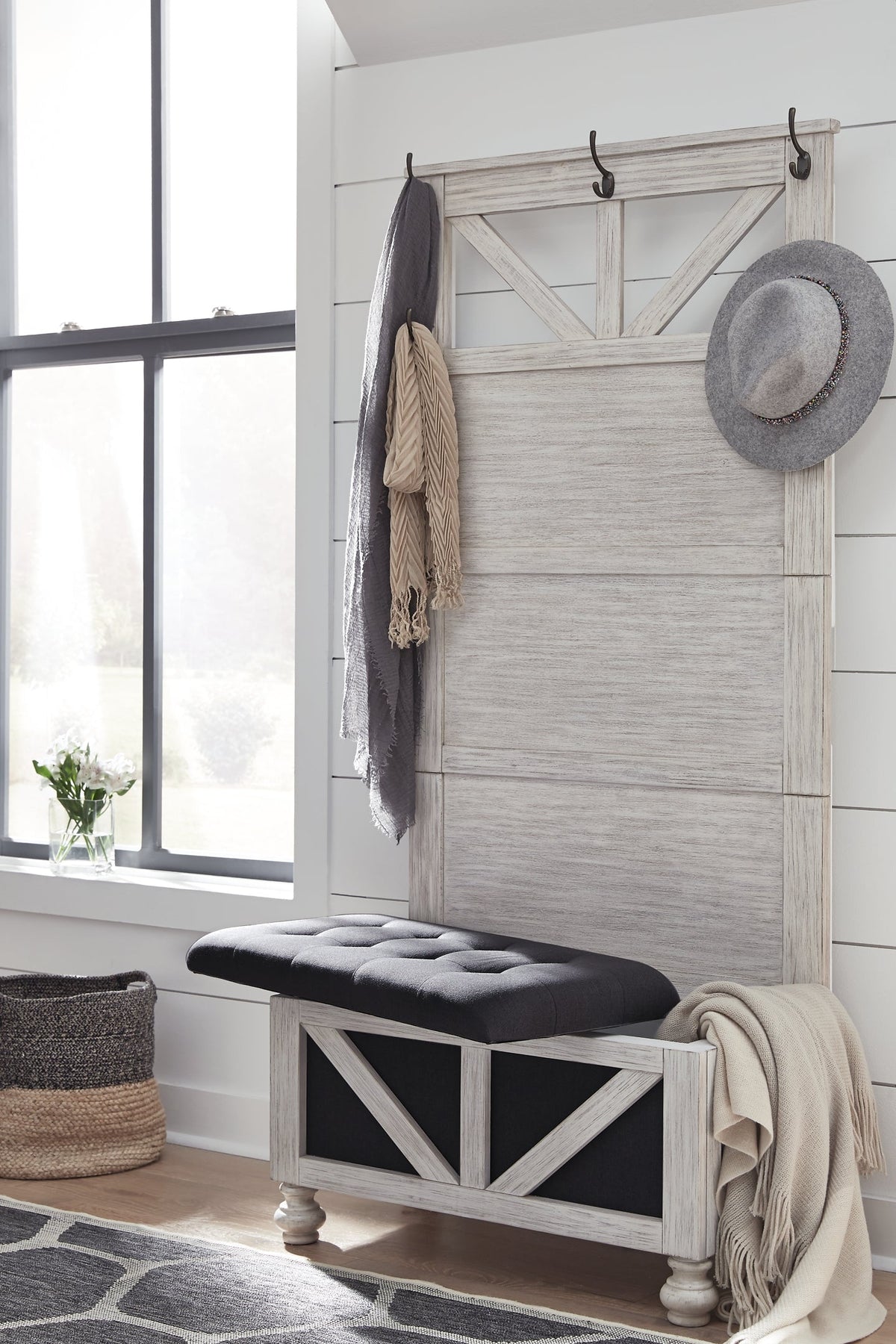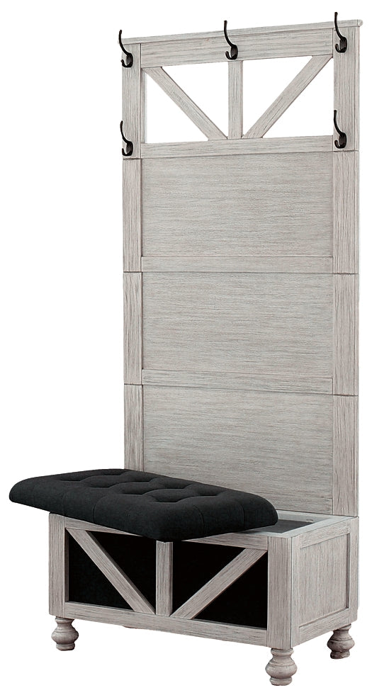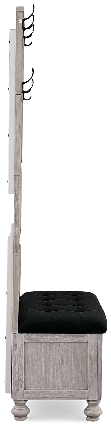 Bring cottage chic and country charm to your foyer, entryway, or mudroom with this hall tree with storage bench. This antiqued white hall tree has a handy storage bench with tufted seat cushion that opens to reveal additional room for mittens, boots and scarves. The hooks on the back provide a handy way to hang your coats or jackets.
