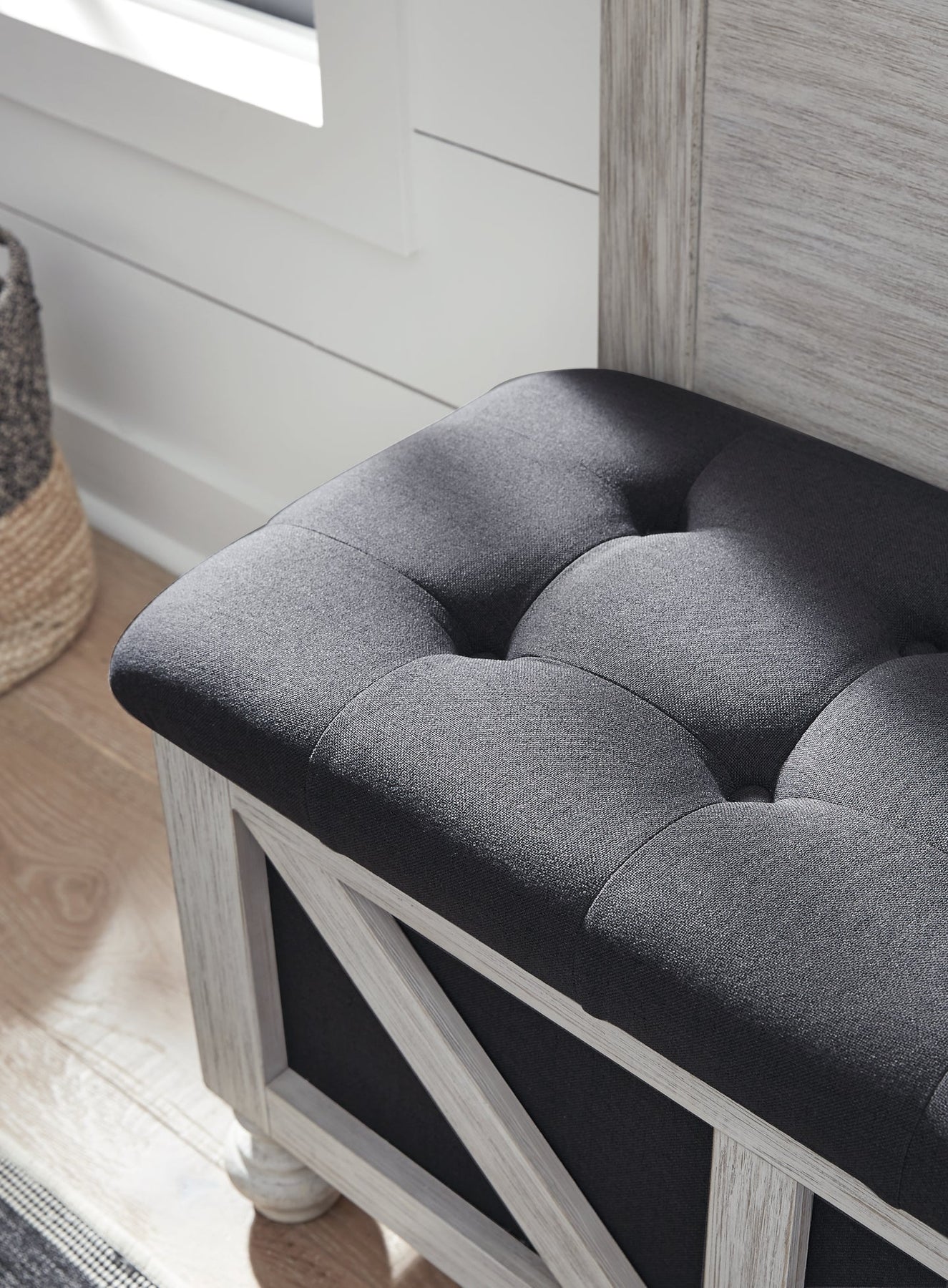 Details Solid wood, veneer and engineered wood, Upholstered in charcoal polyester fabric, High-quality foam cushion, Removable seat for storage, Assembly required