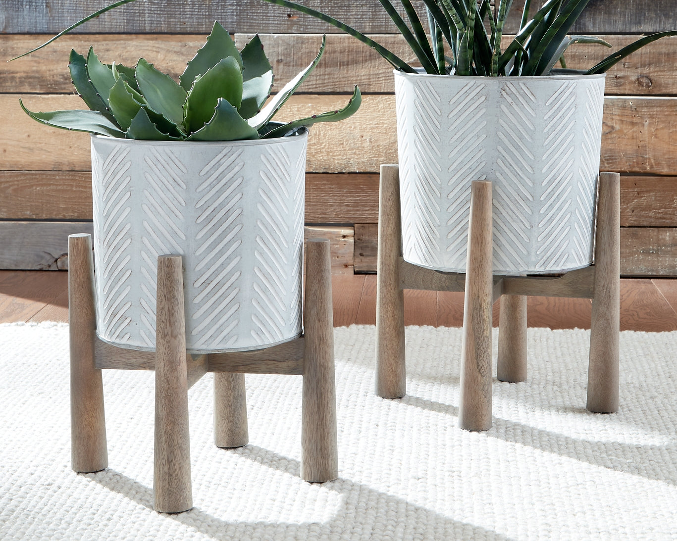 | Details | Made of wood and metal, Set of 2 planters, White and galvanized finished metal planter, Antiqued brown finished wood stand | |