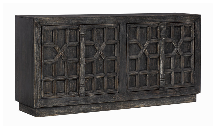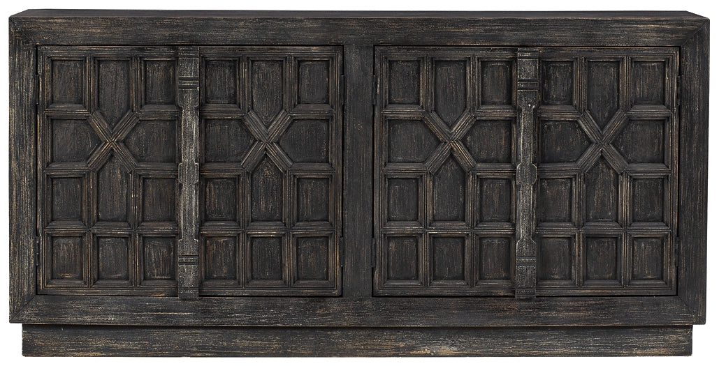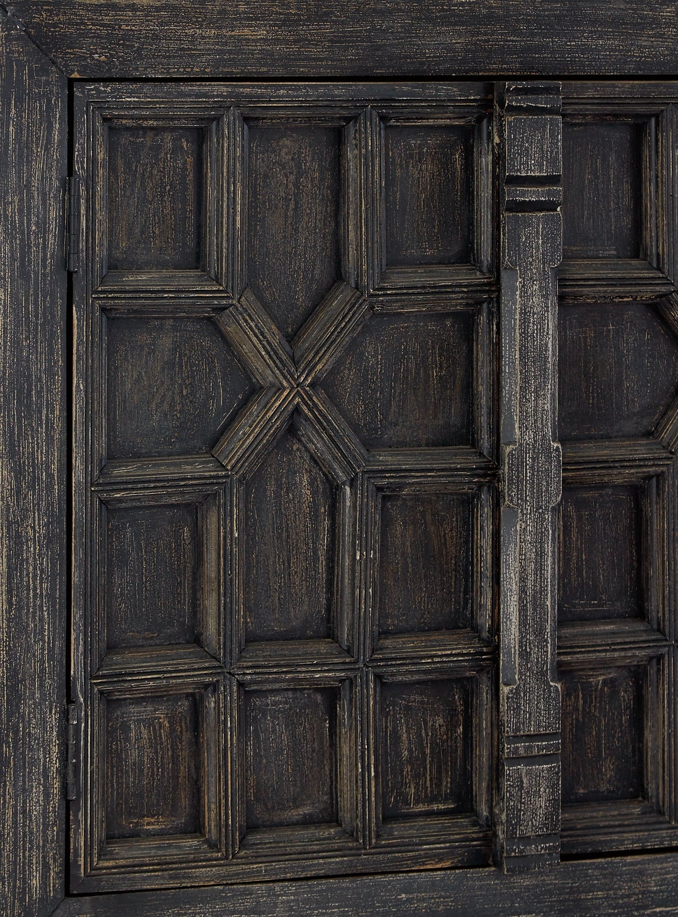 | Details | Solid and engineered wood, Distressed black finish, 4 doors, 2 fixed shelves, Cord openings in back, Assembly required | |