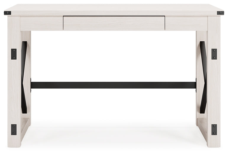 | Details | Made of engineered wood, Decorative wood grain laminate in whitewashed tone, Cross-buck rails, metal accents and stretcher in contrasting black iron tone, Center drawer with metal ball bearing side glides, Assembly required | |