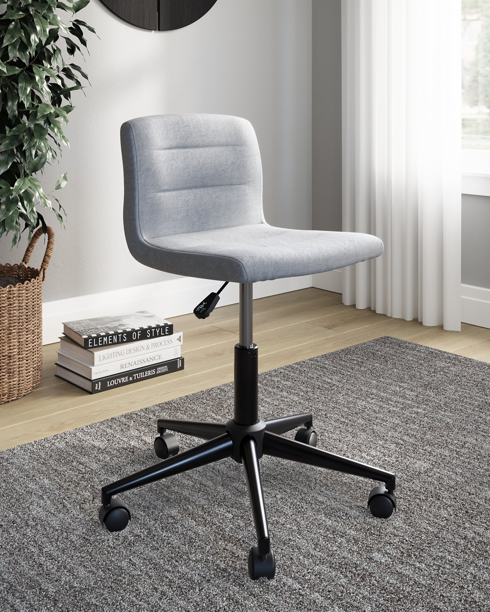 | Details | Metal frame with adjustable height mechanism, Casters for mobility, Cushioned seat and backrest, Channeled details, Upholstered in woven polyester in gray color, Assembly required | |