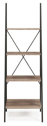 Step up your style with this striking bookcase. Whether for showcasing home accents or housing your collection of books, this brilliantly simple bookcase with four staggered tiers is a mastery in urban casual design. Crafted with a black metal frame with cross-braced styling and engineered wood shelves beautified with a grayish brown decorative wood grain laminate, this open-concept bookcase merges a cool look with a warm feel. Use as a single bookcase or combine two or more for a bunching wall.
