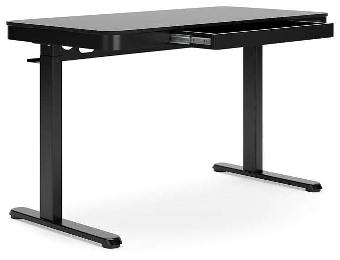 Work smarter (and look cool doing it) with the new-age efficiency of this adjustable height home office desk. Its streamlined design is ideal for working from home, with a powered height adjustment feature enabling you to find your ultimate comfort position. The super-sleek black desk also includes two types of USB charging ports and a smooth-gliding drawer, so you can have elite form and function all in one.