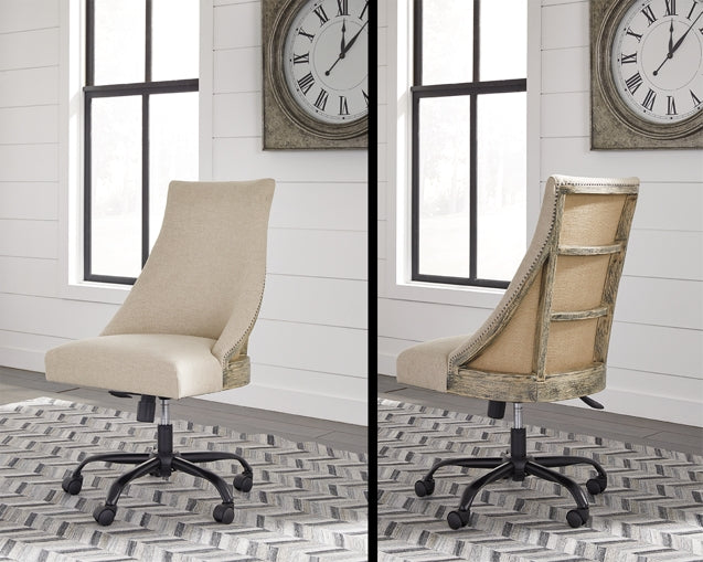 Why play it safe when you can play it cool. With its “deconstructed” styling, this swivel desk chair takes a decidedly different turn on home office furniture. Talk about a split personality. The front of the chair is covered in a cream fabric. On the back: textural burlap under an exposed—and highly distressed—wood frame for a contrast that’s quite unexpected, yet such a welcome surprise.