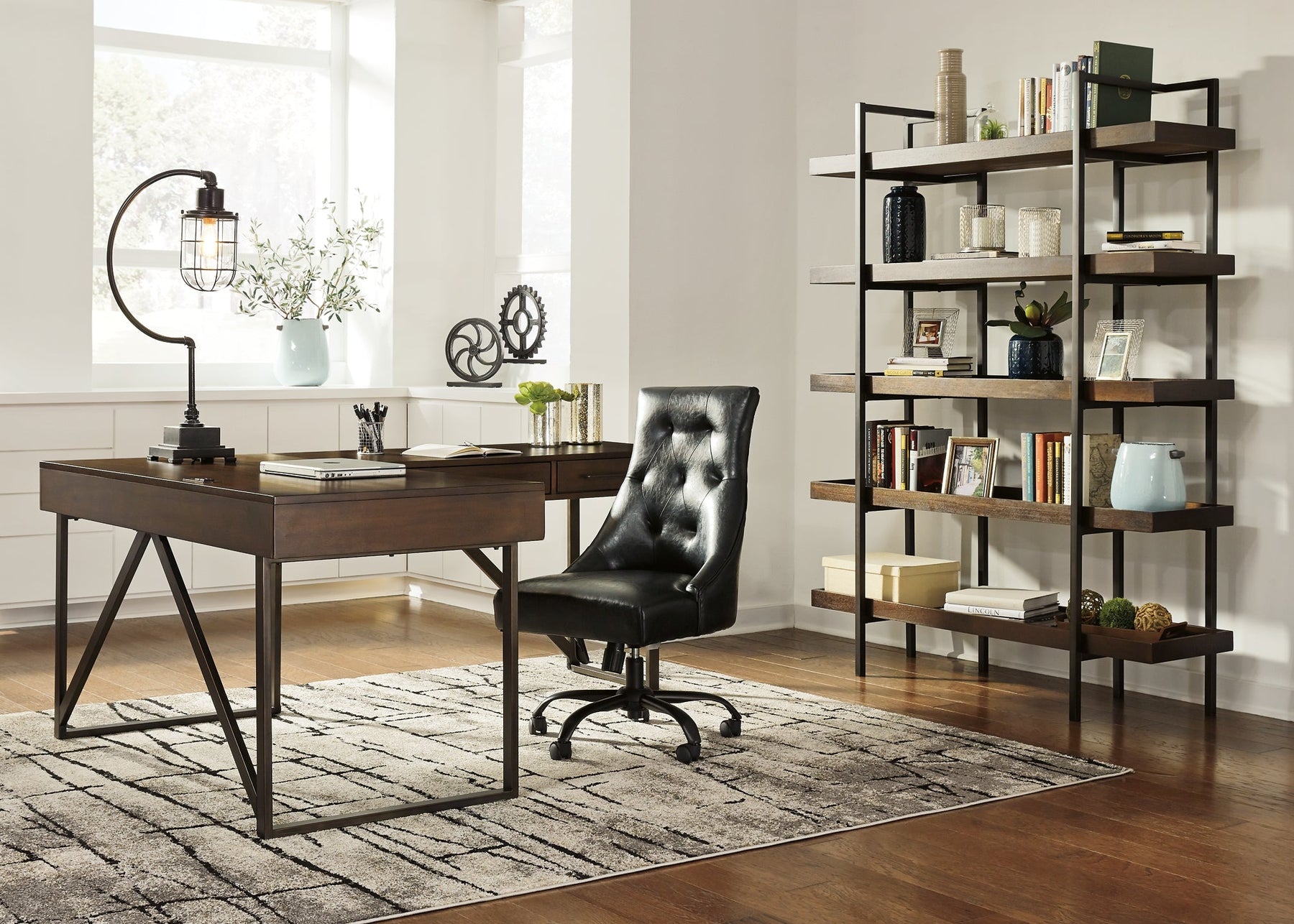 | Details | Includes desk and desk return, Top made of acacia veneers, wood and engineered wood in oil-rubbed walnut finish, Metal base and hardware in bronze-tone finish, Return with 2 smooth-gliding drawers, Desk with drop-front drawer, Built-in power station with 2 AC electrical plug-ins and 2 USB slots, Power cord included; UL-listed, Assembly required | |