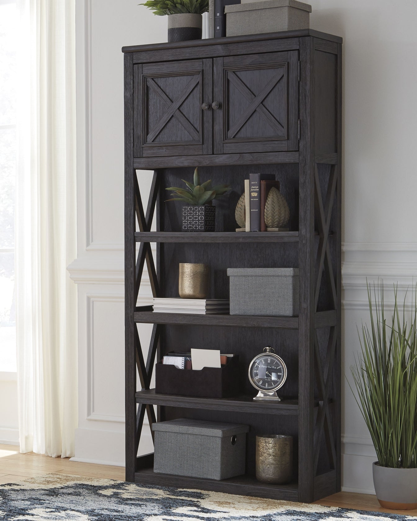 | Details | Made of veneers, wood and engineered wood, Textured black finish, 3 shelves (middle shelf is fixed; others are adjustable), Double door cabinet, Antiqued bronze-tone knobs, Assembly required | |