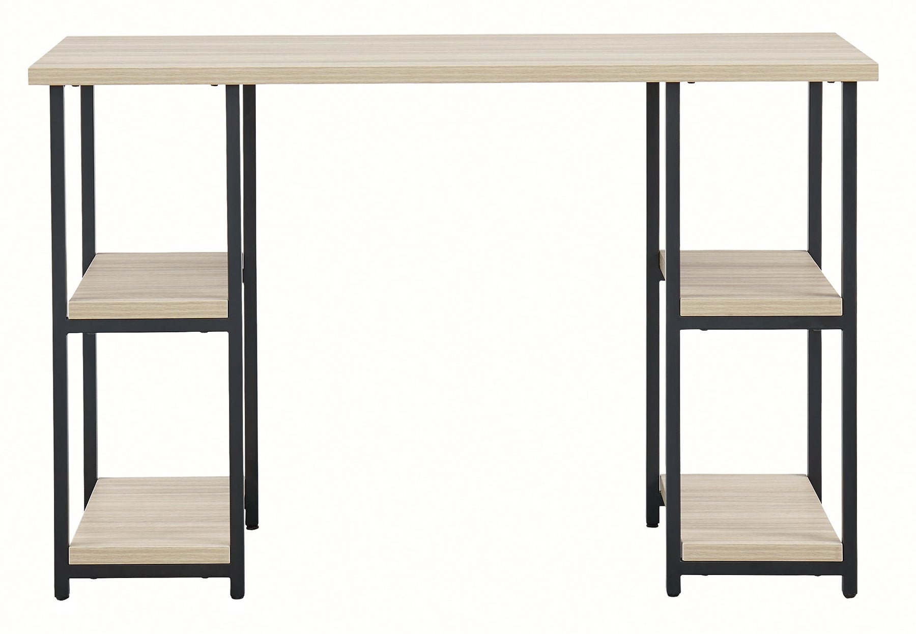 | Details | Made with melamine top and shelves, metal base, Base with powder coated finish, Top and shelves with replicated exotic wood grain in a light tan, natural wood color, Double-shelf pedestal design, Assembly required | |