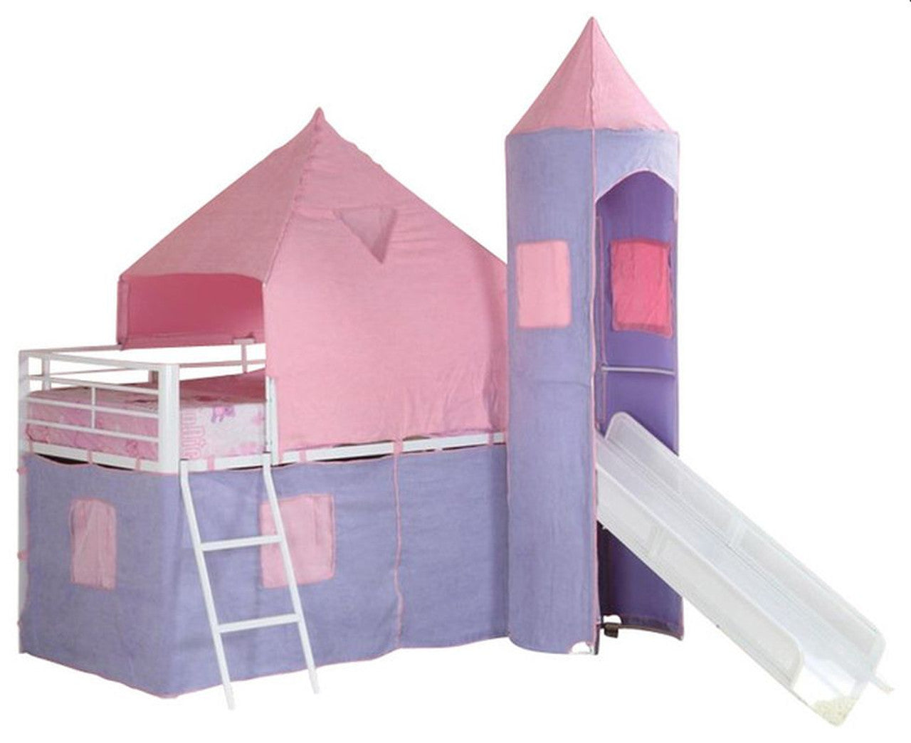 Every princess deserves a castle, and this castle-style tent bed is even better than the real thing. No dark and damp corners here, only a twin metal bed finished in delightful white. Includes soft purple and pink tent cover to give your princess the privacy she needs. Ladder accesses the bed on the upper level with ease. An attached slide means this piece is also a wonderland playground that will bring hours of smiles.