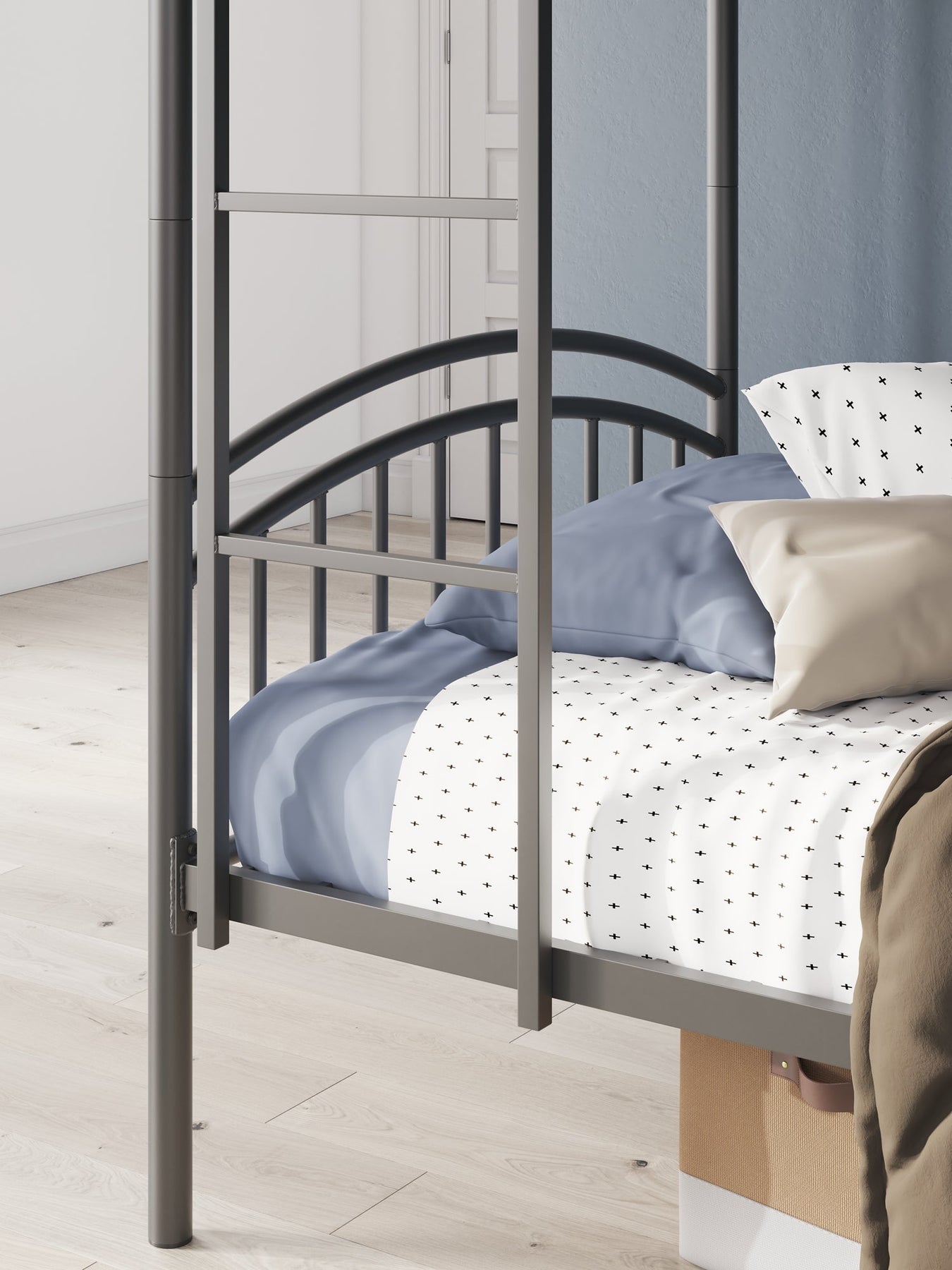 | Details | Made with welded tubular steel frame, Durable steel gray powder coat finish, Tubular steel slats for mattress support, Top bunk with protective side rails, Sturdy ladder leads to top bunk, Ladder with left or right side convertibility, Bunk can convert into two twin beds, Bed does not require additional foundation/box spring, Mattress available, sold separately, The Consumer Product Safety Commission states top bunks not be used for children under 6 years of age, Assembly required | |