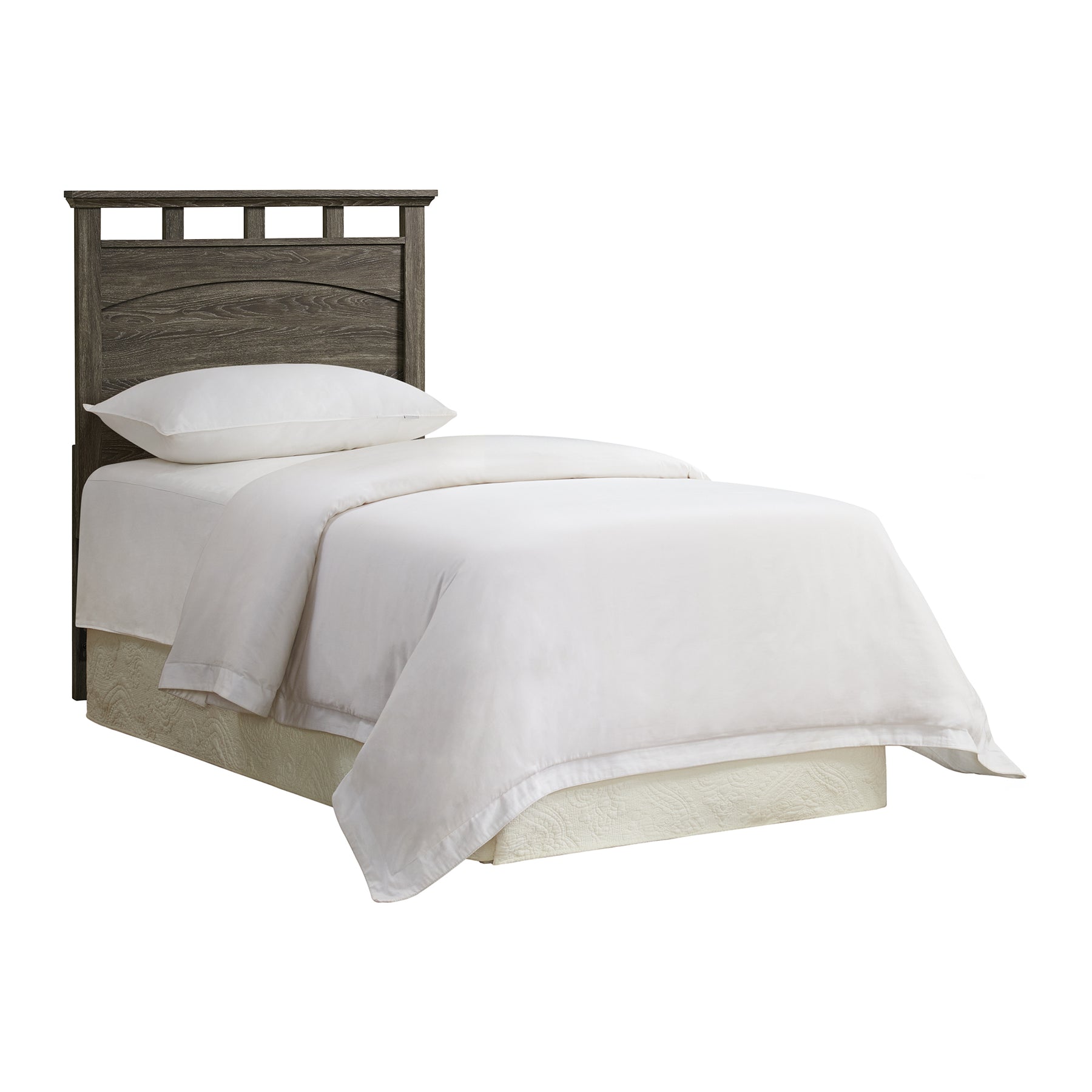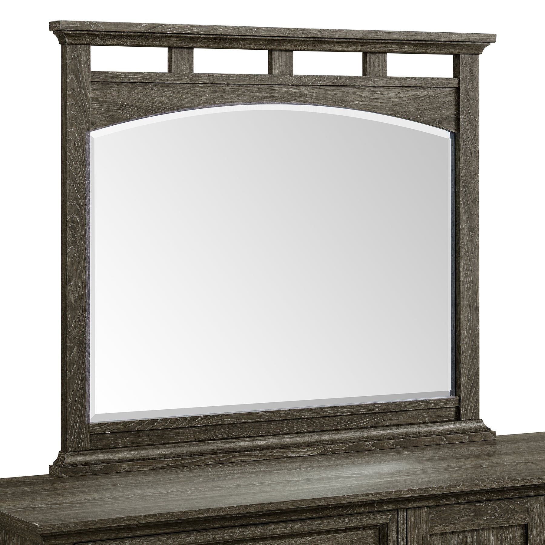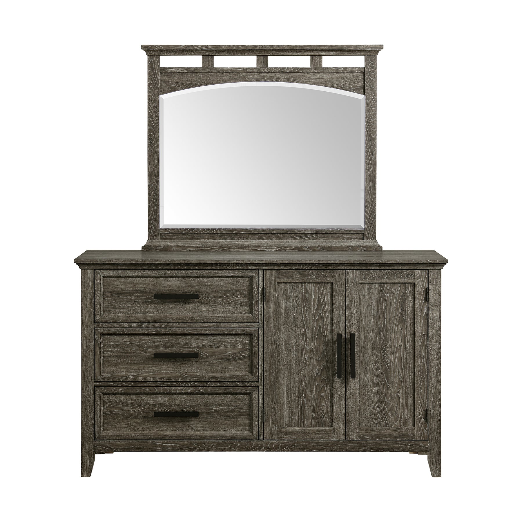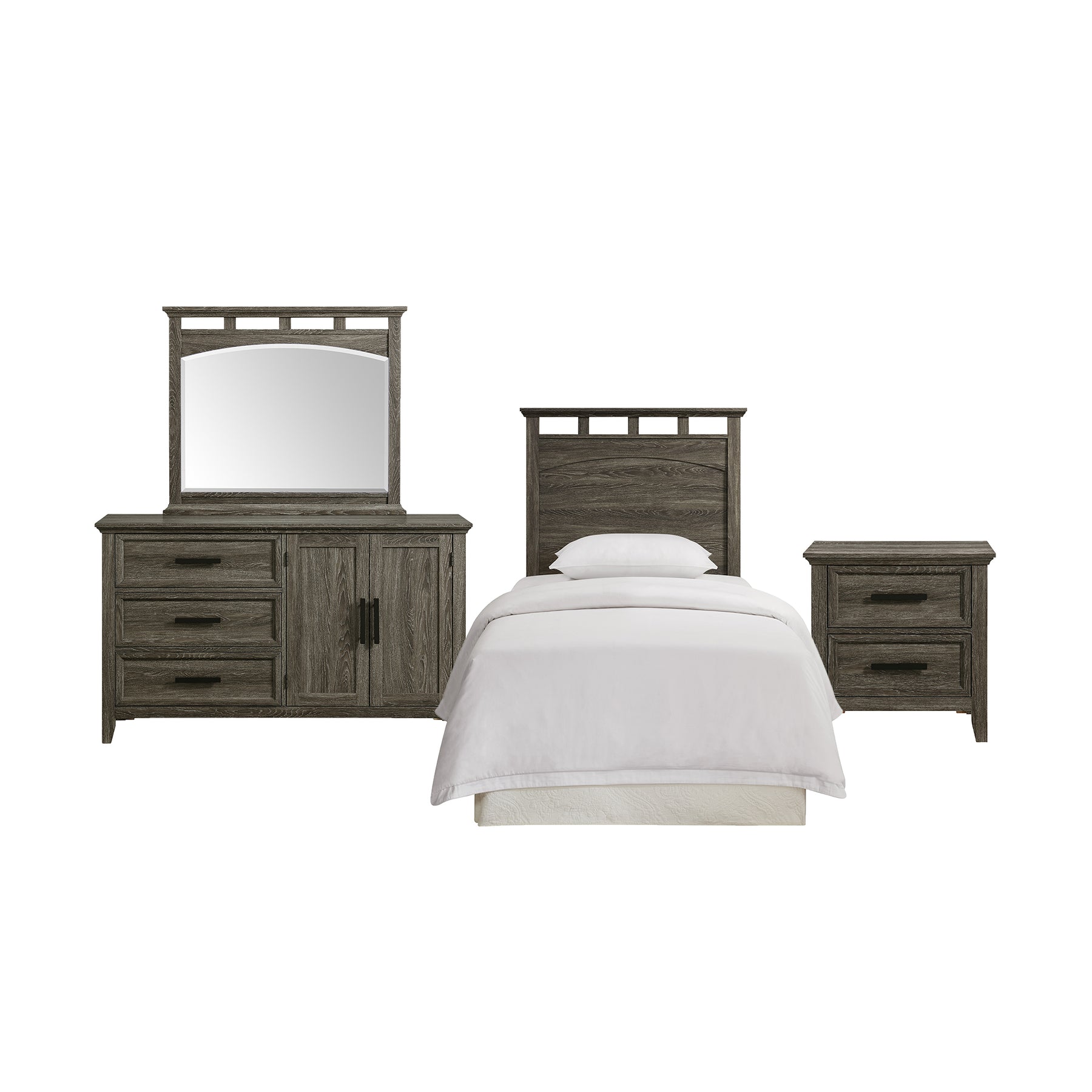 The Matias 4-Piece Bedroom Set offers a stylish and functional solution for a complete bedroom makeover — all in one convenient box. Perfect for kids' rooms, guest rooms, or smaller spaces, this twin-sized set includes everything you need. The headboard and mirror feature distinctive boarded openings that add visual interest, while the elegantly arched mirror gives the set a touch of refined style. The dresser includes both drawer and cabinet storage, providing versatile organization options. With its transitional design and sophisticated mocha grey finish, the Matias collection complements any space effortlessly.