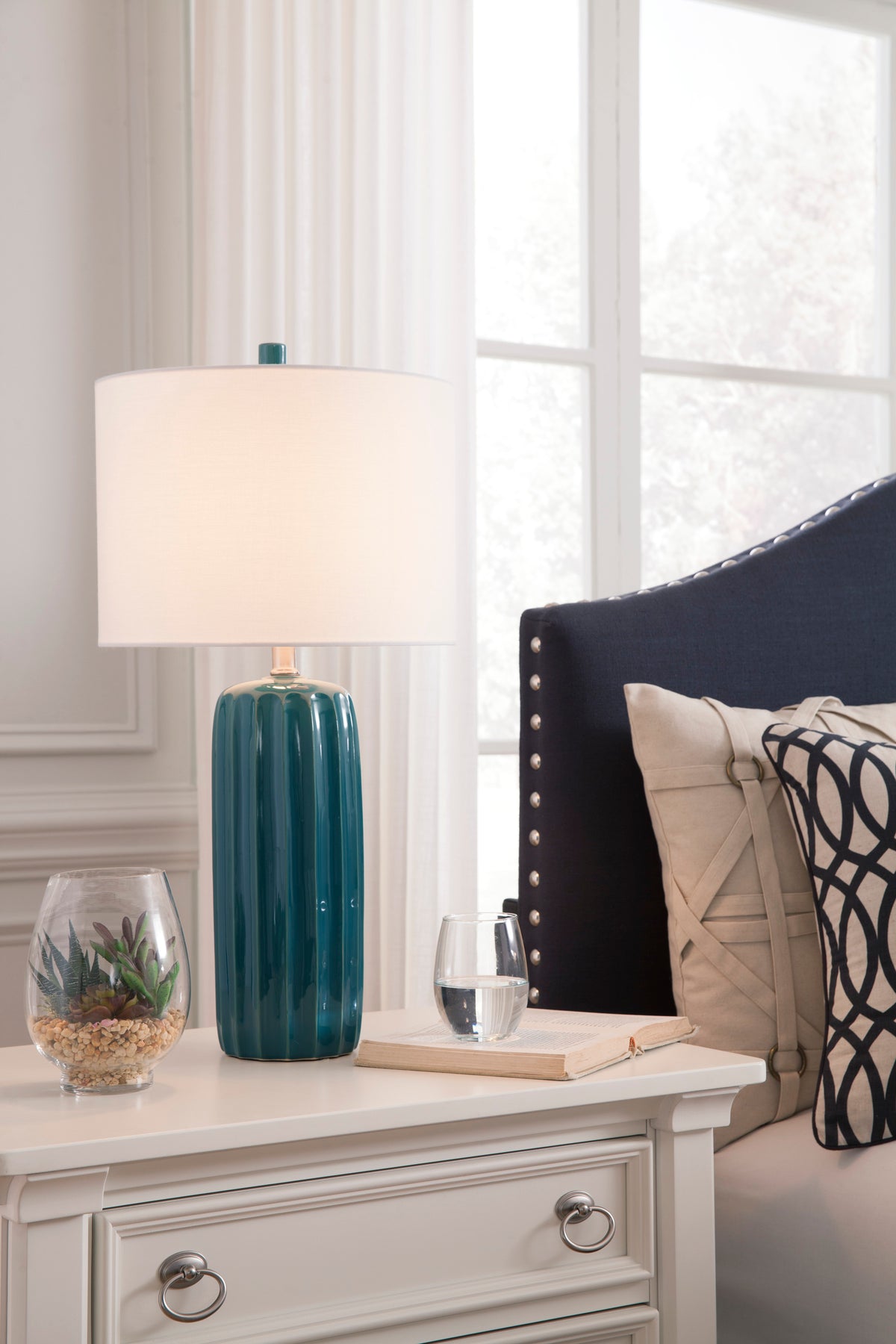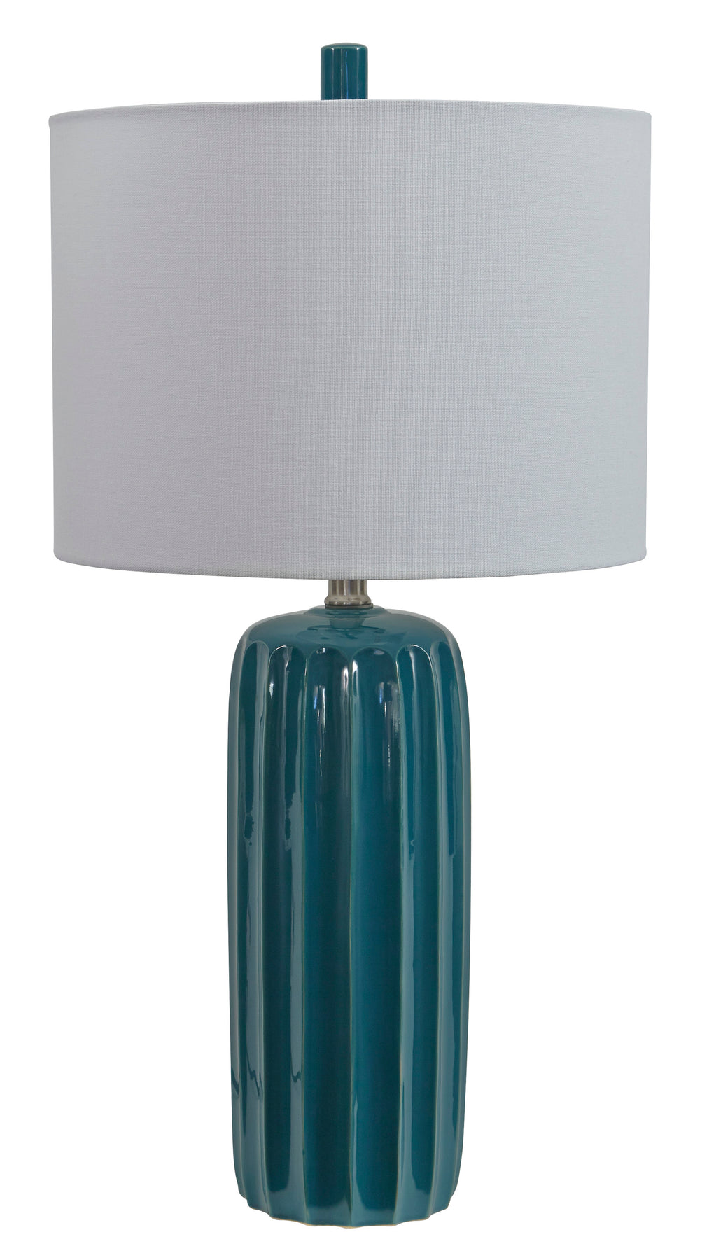 A teal glossy hue and grooved design make the Adorlee table lamp hard to miss. Its eye-catching design is contemporary and unique.