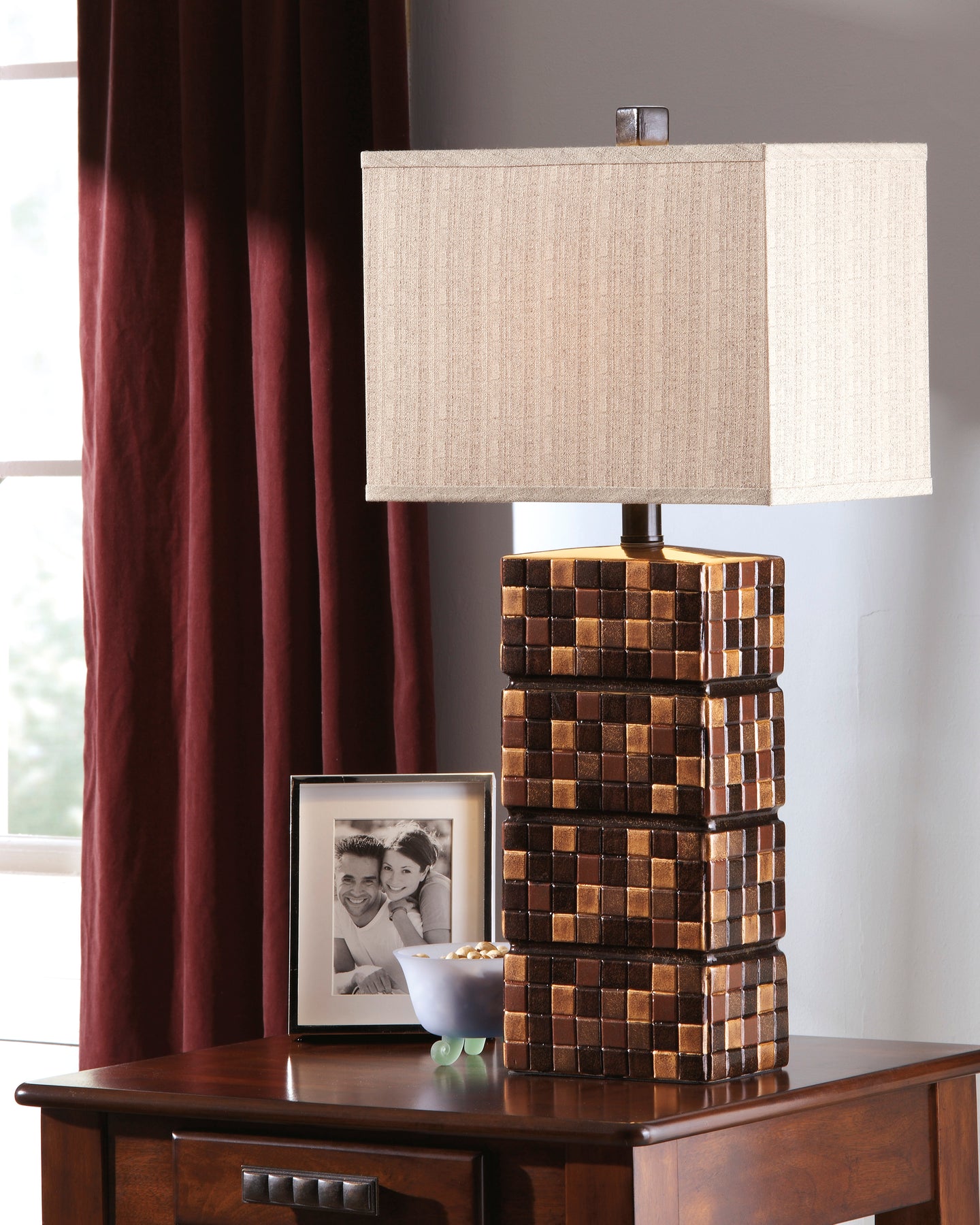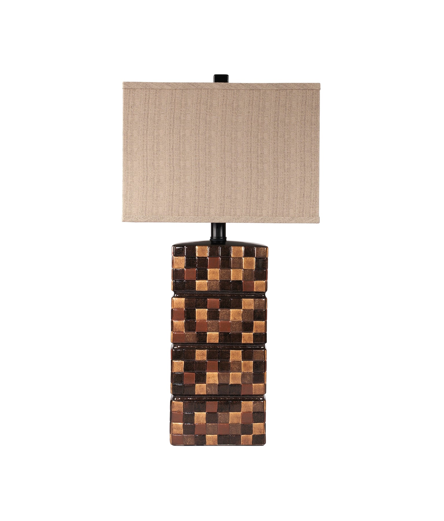 The Helki Table Lamp is a multi brown ceramic table lamp topped with a rectangle shade and features a 3-way switch.(2 per carton).