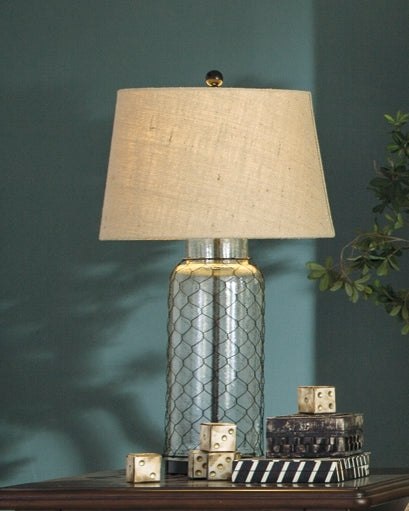 | Details | Lamp base made of clear glass with wire metal detail, Versatile style easily complements coastal chic, modern farmhouse and vintage-inspired spaces, Modified drum shade with beige fabric and naturally beautiful linen-weave texture, 3-way switch makes this lamp a smart choice for task lighting, 1 type A bulb (not included); 150 watts max or CFL 25 watts max; UL Listed, Clean with a soft, dry cloth, Assembly required | |