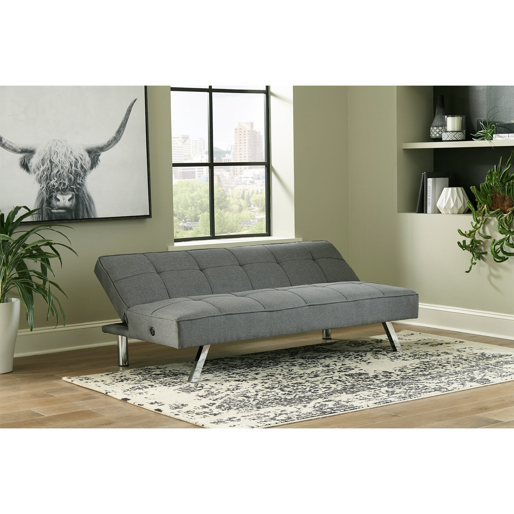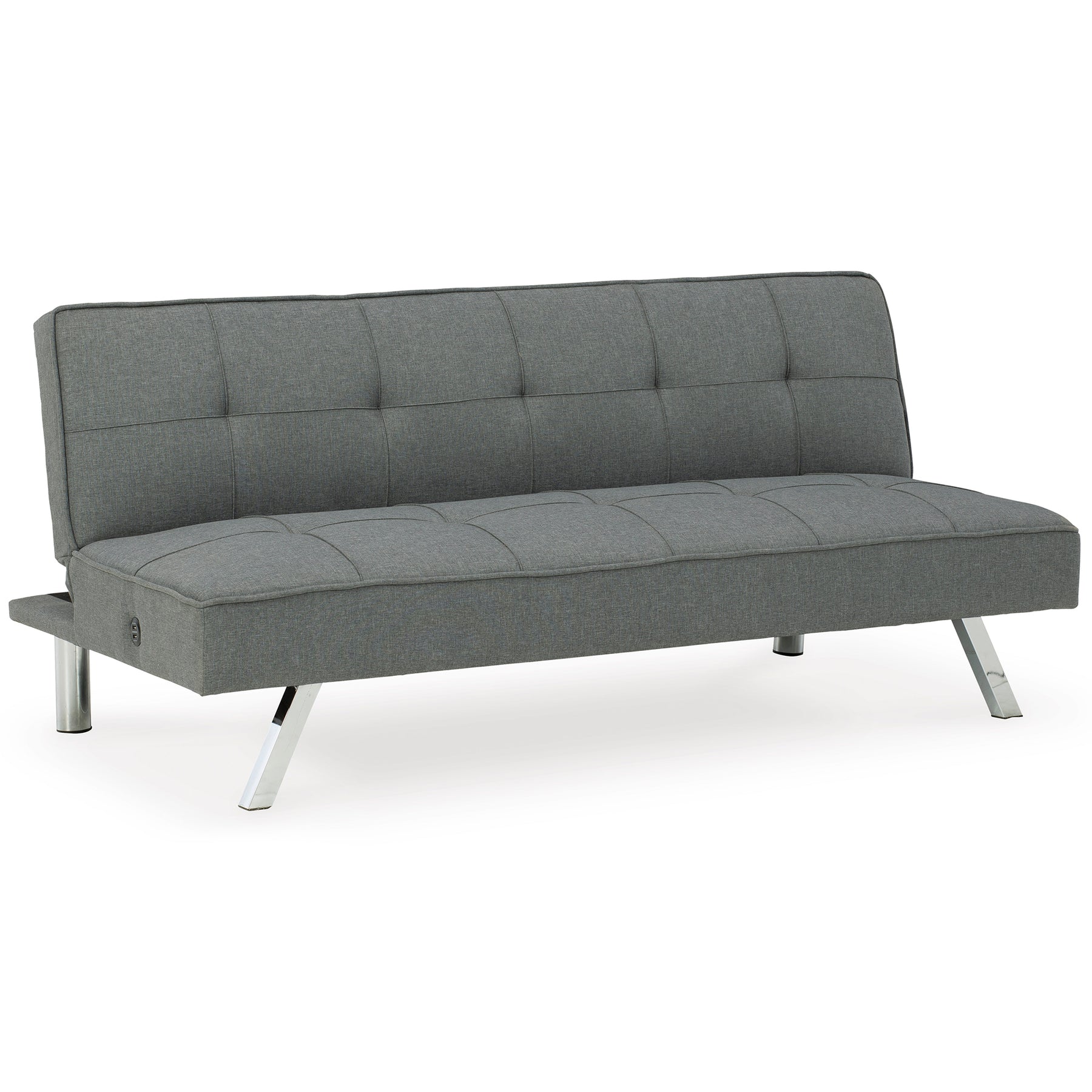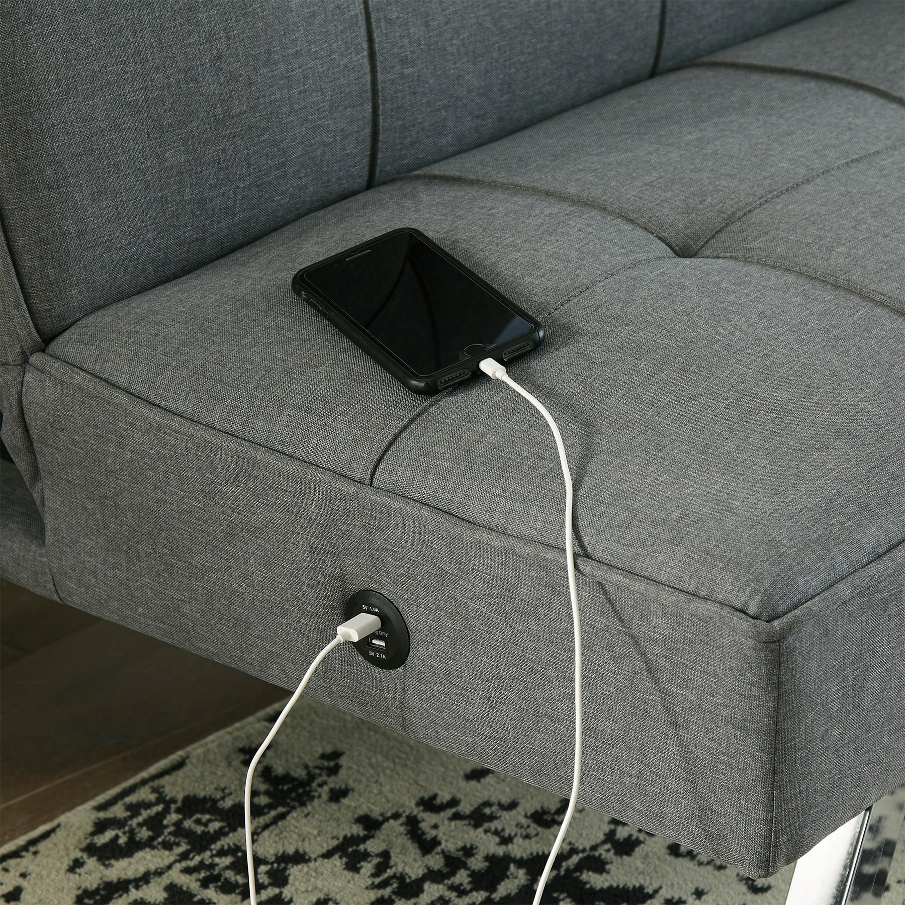 Details Attached back and seat cushions, High-resiliency foam cushions wrapped in thick poly fiber, Polyester upholstery, Tufted details, 2 USB ports; power cord included; UL Listed, Exposed chrome-tone metal feet