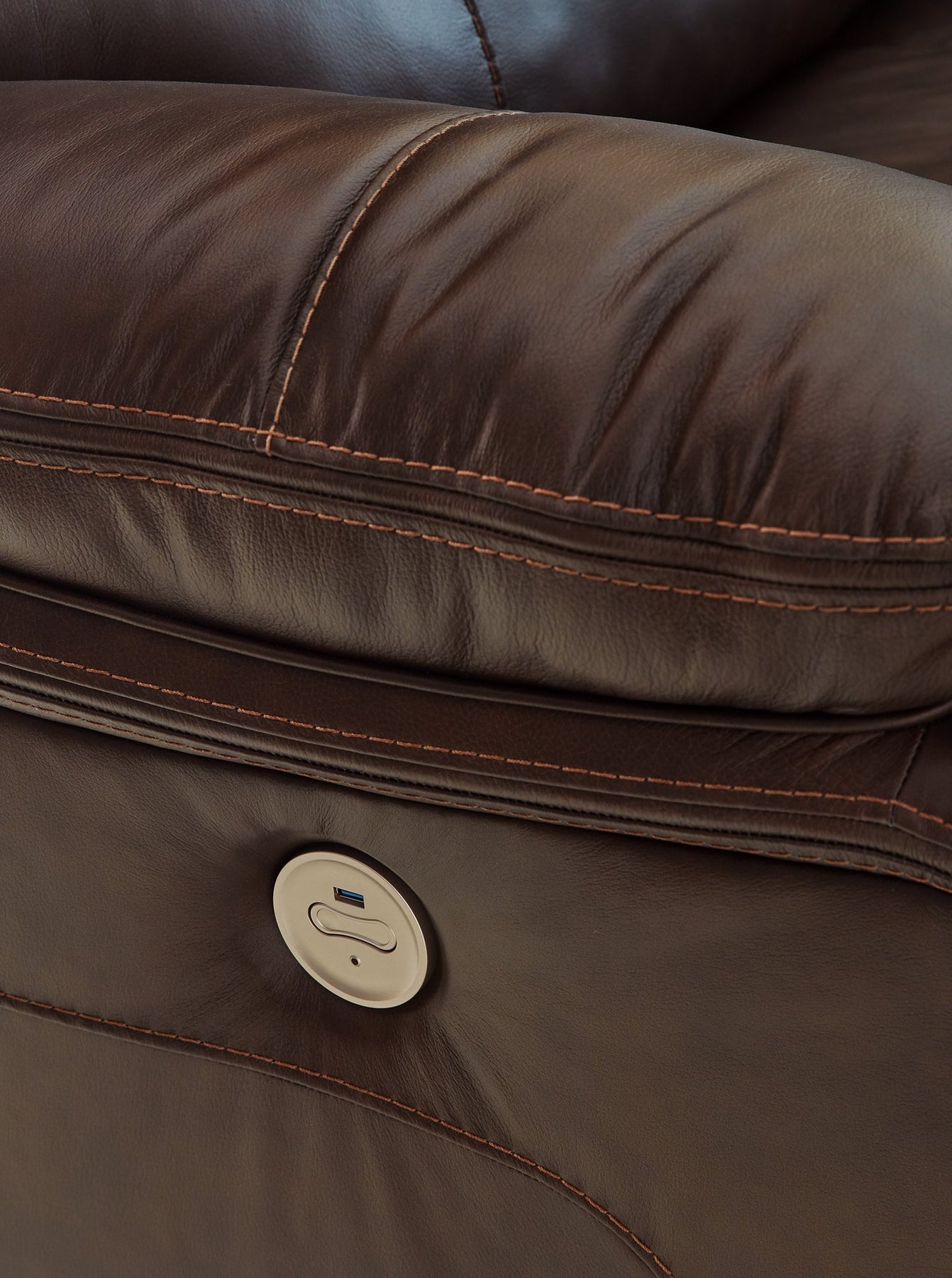 Details Includes 3 pieces: left-arm facing power reclining loveseat with console, wedge and right-arm facing power reclining loveseat, "Left-arm" and "right-arm" describe the position of the arm when you face the piece, One-touch power control with adjustable positions and zero-draw USB port, Zero-draw technology only consumes power when the USB receptacle is in use, Corner-blocked frame with metal reinforced seat; attached cushions, High-quality foam cushions wrapped in poly fiber, Combination leather/faux leather upholstery provides the look and feel of real leather at a fraction of the cost, 100% top grain leather covers inside areas such as the back, seat and arm cushions; skillfully matched faux leather covers the remaining areas, Due to its natural origin, real leather can show individual characteristics such as healed scars, growth marks, grain variation and shade variation, Natural variations make each hide unique and do not detract from the wearing qualities of leather, Pigmented corrected grain leather, Console with 2 cup holders and hidden storage, Power cord included; UL Listed