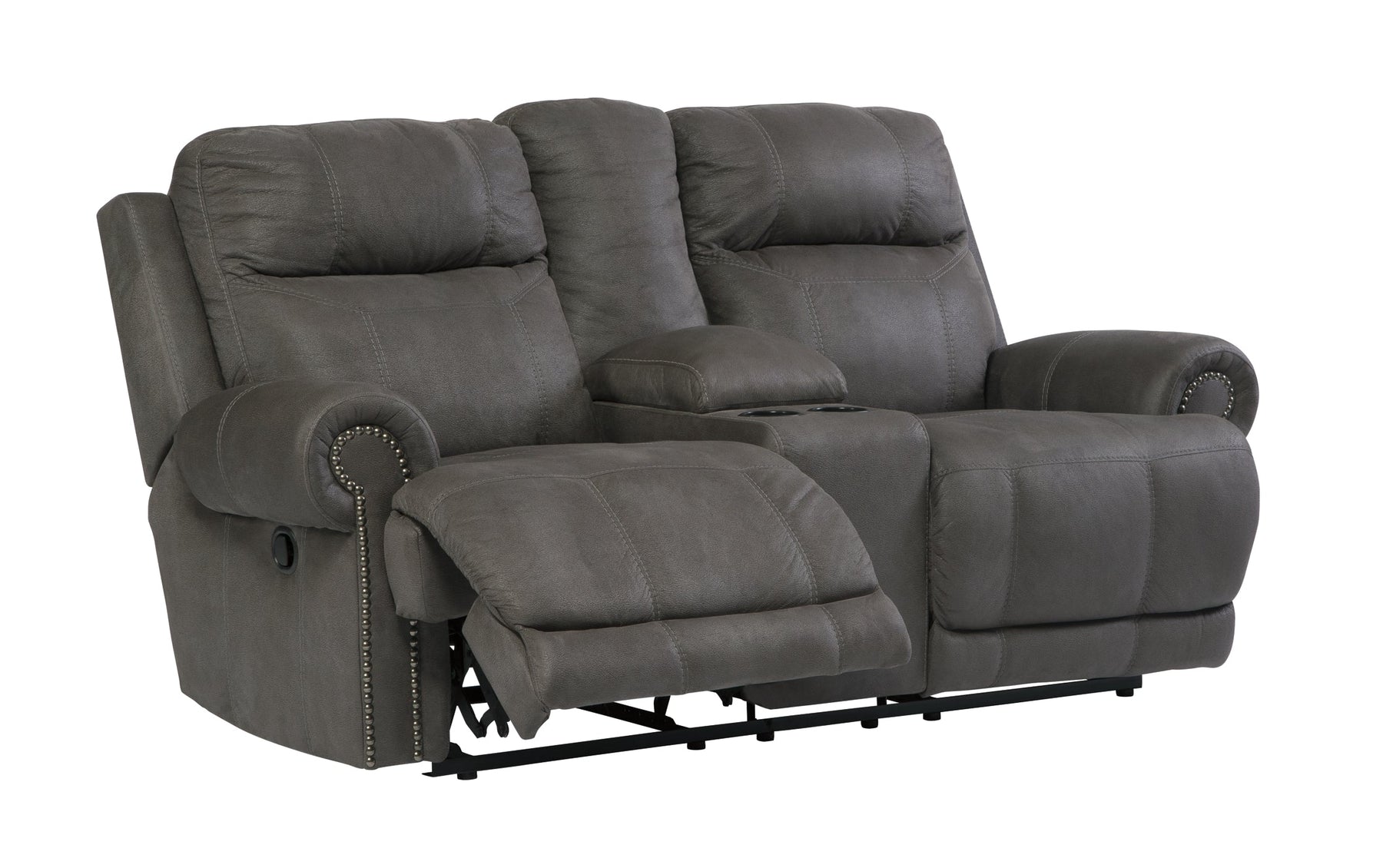 Sparing that "puffy" look you might expect from a recliner, this reclining sofa and loveseat set doesn't hold back when it comes to contemporary style. Subtle touches such as sporty jumbo stitching, nailhead trim and a "weather worn" effect on the upholstery give this handsome set a buttoned-up appeal and fresh feel. Loveseat’s center console with dual cup holders brings a handy element to the arrangement.
