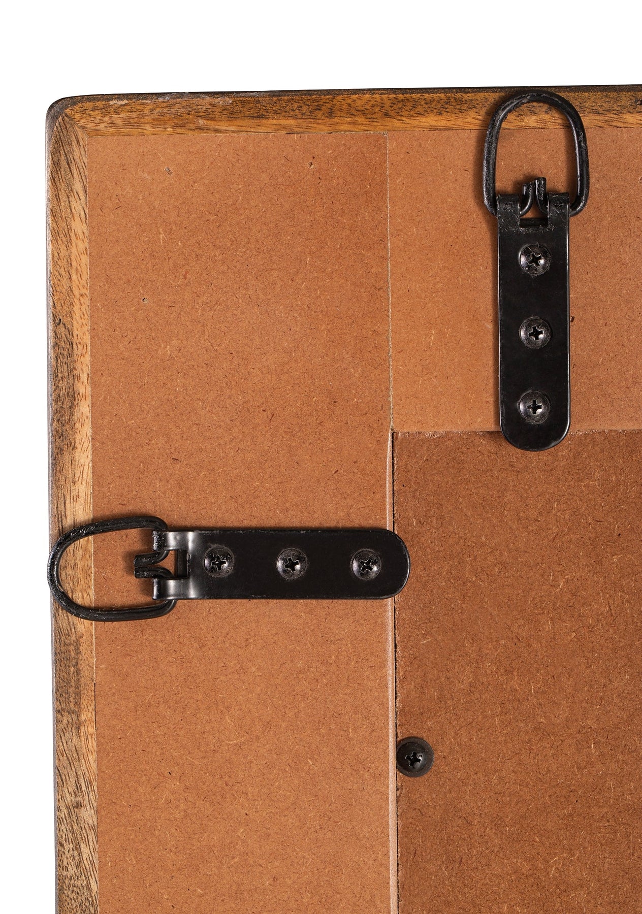 Details Made with wood, Dark brown finish, Carved accents, Due to the finishing process, some variations may occur, Keyhole bracket for hanging, Vertical and horizontal hanging