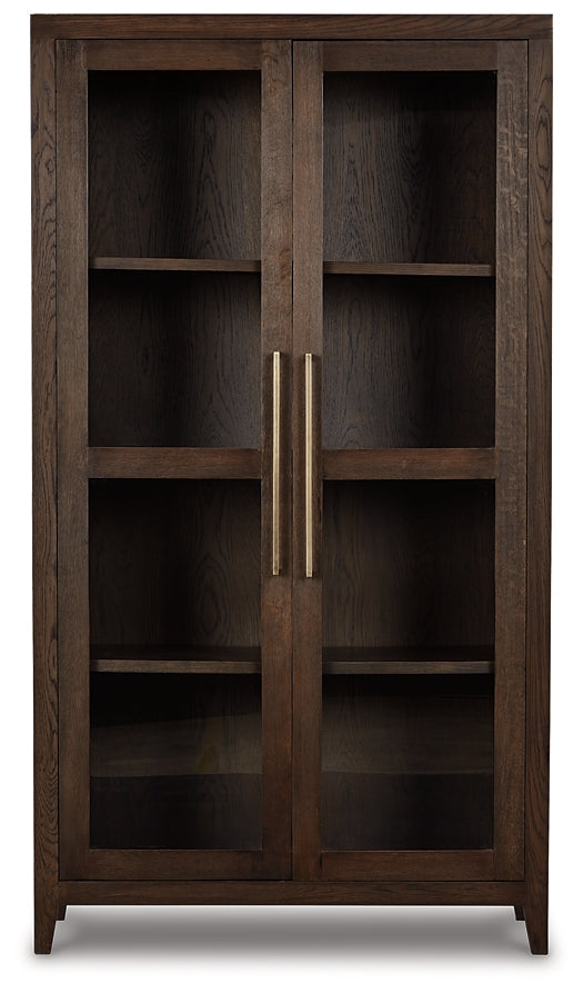 Chic and sleek, this accent cabinet satisfies your taste for contemporary design. Its dark brown finish is neutral and refined, while antiqued brass-tone hardware adds a touch of glamour. With glass front doors plus a mix of adjustable and fixed shelving, it's easier than ever to display and store in striking style.