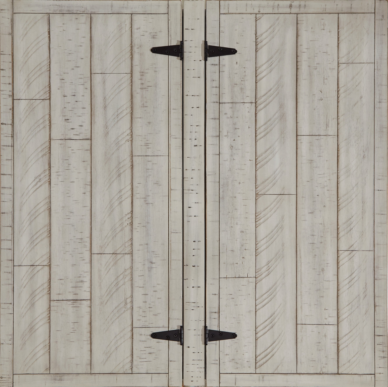 Details Made of pine wood, acacia veneer and engineered wood, Distressed whitewash finish, Metal bracket accents, Crossbuck details, 2-sided hinged lift top (with stay arms), Assembly required