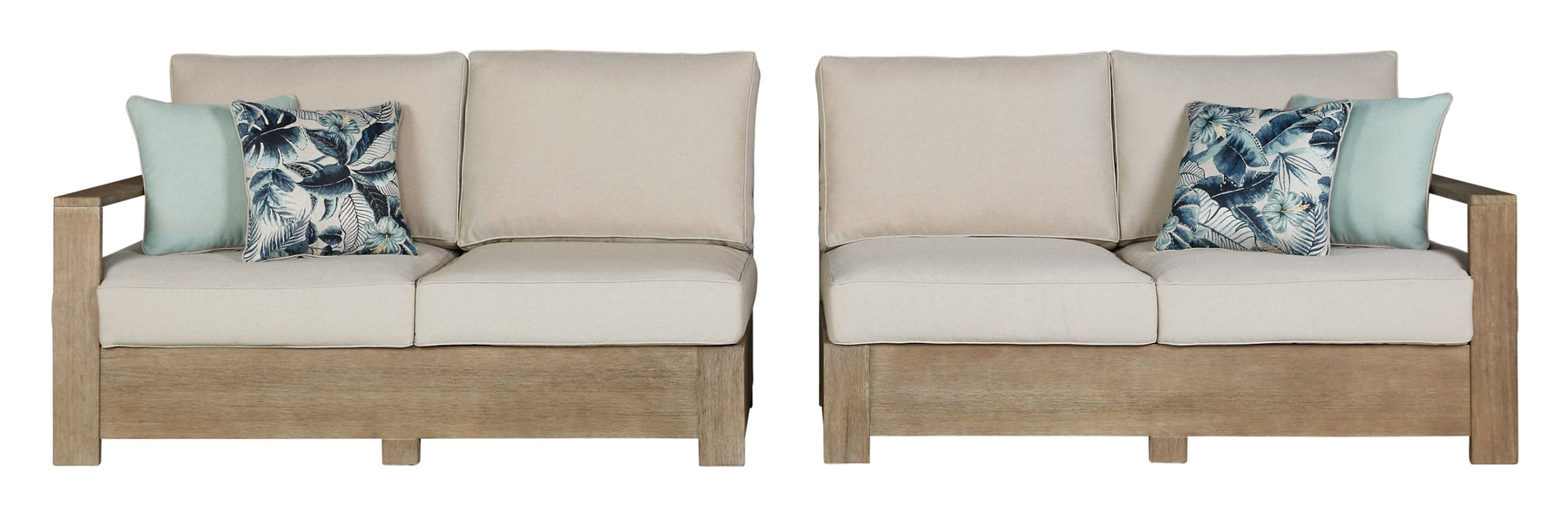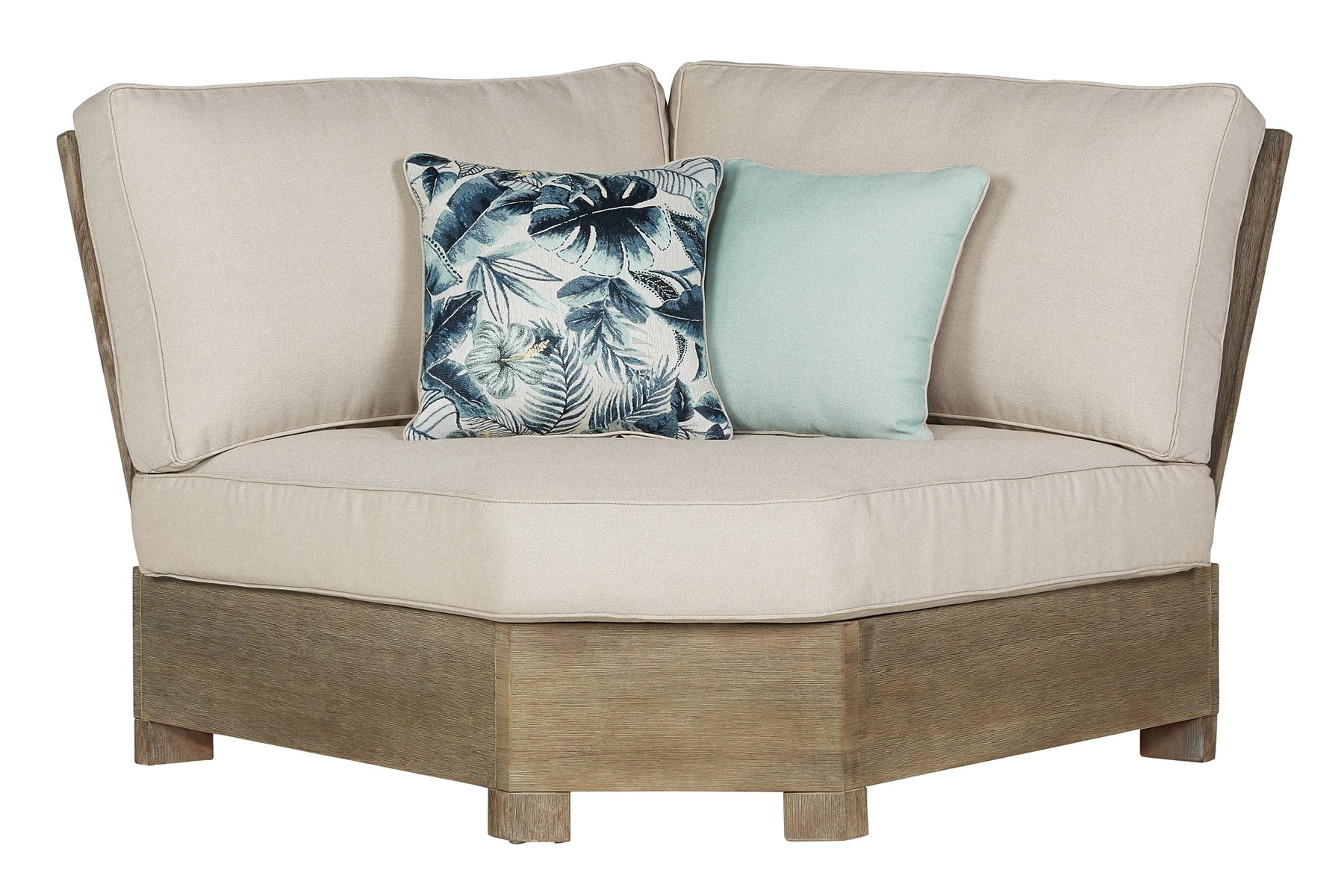 Details Includes 3-piece outdoor sectional (right-arm facing loveseat, corner chair with cushion and left-arm facing loveseat) and armless chair, Left-arm and "right-arm" describe the position of the arm when you face the piece, Made of eucalyptus wood, Multi-step embossed finish, Seat backs/cushions and throw pillows covered in solution-dyed Nuvella® (polyester) high-performance fabric, All-weather foam cushion core wrapped in soft polyester, Throw pillows included, Clean fabric with mild soap and water, let air dry, Imported fabric and fill, Assembly required