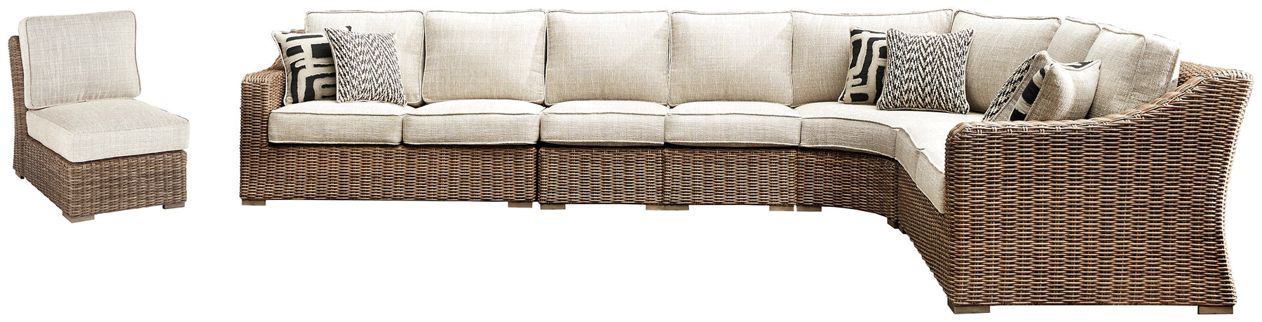 | Details | Includes 3 armless chairs with cushions, curved corner chair with cushion, left-arm facing loveseat and right-arm facing loveseat, "Left-arm" and "right-arm" describe the position of the arm when you face the piece, All-weather resin wicker handwoven over powder coated rust-proof aluminum frames, Throw pillows included, Zippered cushions and throw pillows covered in high-performing Nuvella® fabric, All-weather foam cushion core wrapped in soft polyester, Clean fabric with mild soap and water, let air dry; for stubborn stains, use a solution of 1 cup bleach to 1 gallon water, Imported fabric and fill, Assembly required | |