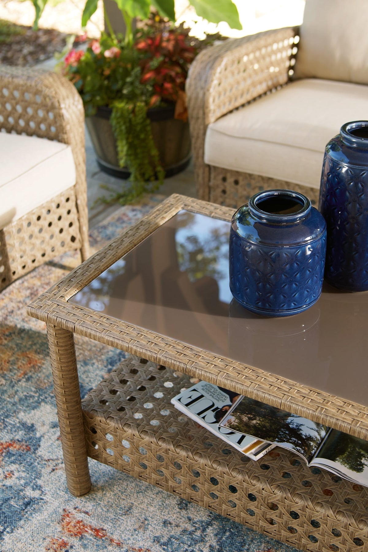 Details Includes loveseat and coffee table, Driftwood resin wicker over powder coated steel frame, Stainless steel hardware, Coffee table with driftwood color tempered glass top, Beige cushions covered in easy-clean polyester (Nuvella®) high-performance fabric, All-weather foam cushion core wrapped in soft polyester, Clean fabric with mild soap and water, let air dry; for stubborn stains, use a solution of 1 cup bleach to 1 gallon water, Assembly required