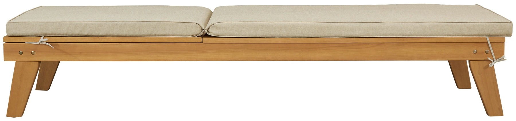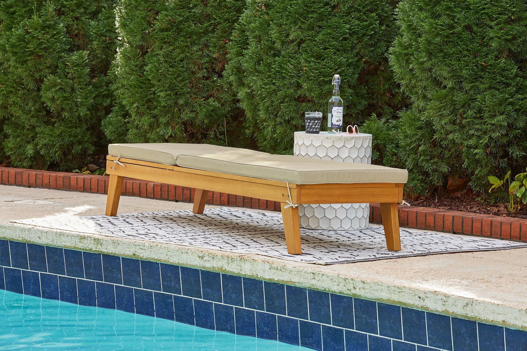 | Details | Made of eucalyptus wood, Cushion covered in solution-dyed Nuvella® (polyester) high-performance fabric, All-weather foam cushion core wrapped in soft polyester, Clean fabric with mild soap and water, let air dry; for stubborn stains, use a solution of 1 cup bleach to 1 gallon water, Imported fabric and fill, Chaise lounge with multiple recline positions, Lays flat for sunbathing on either side, Assembly required | |