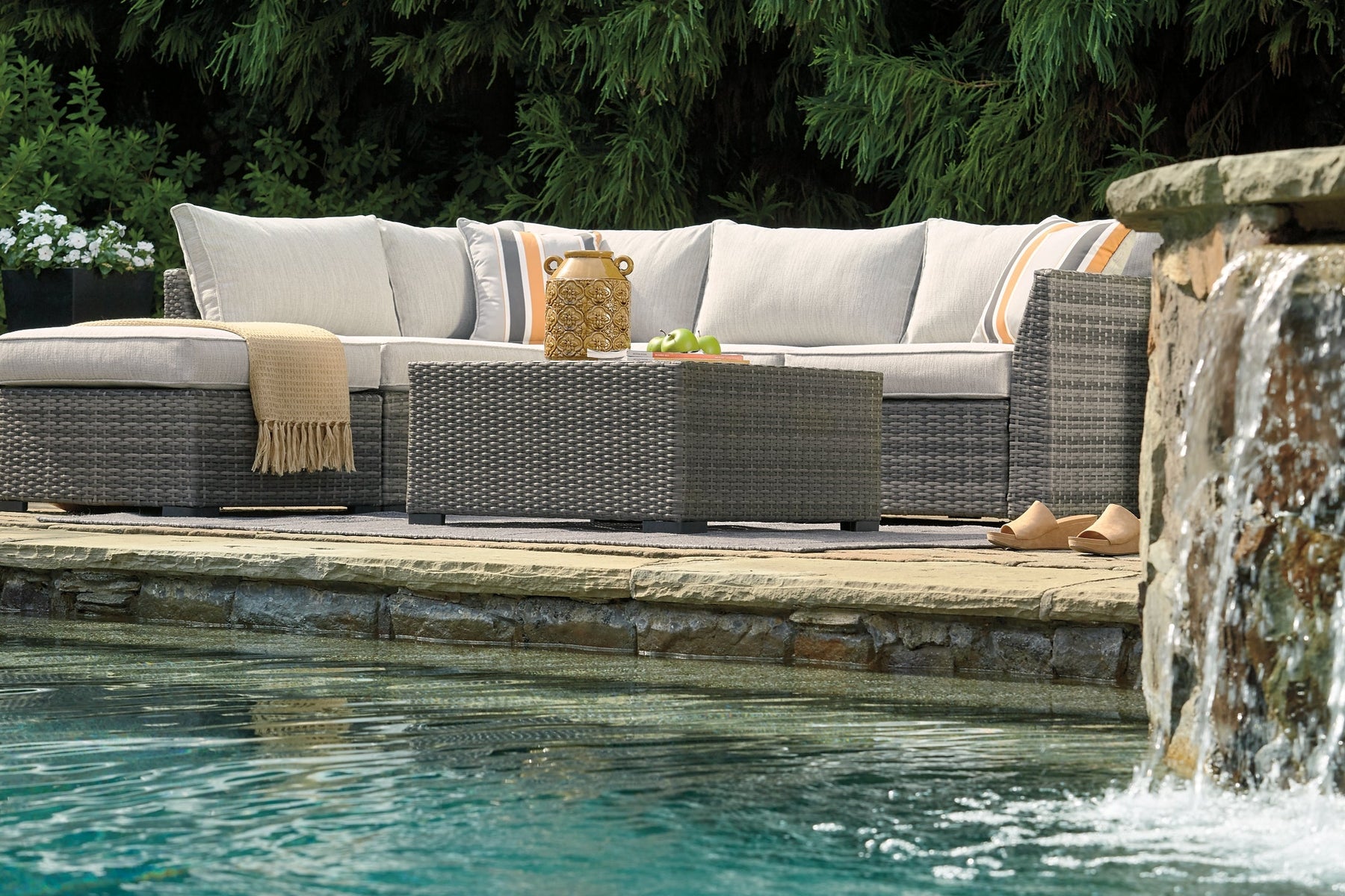 | Details | Includes sectional (with loveseat/ottoman) and coffee table, All-weather resin wicker handwoven over rust-free aluminum frame, Resin wood-look tabletop, Zippered cushions covered in high-performing Nuvella® fabric, All-weather foam cushion core wrapped in soft polyester, Imported fabric and fill, Includes 2 throw pillows, Clean fabric with mild soap and water, let air dry; for stubborn stains, use a solution of 1 cup bleach to 1 gallon water, Assembly required | |