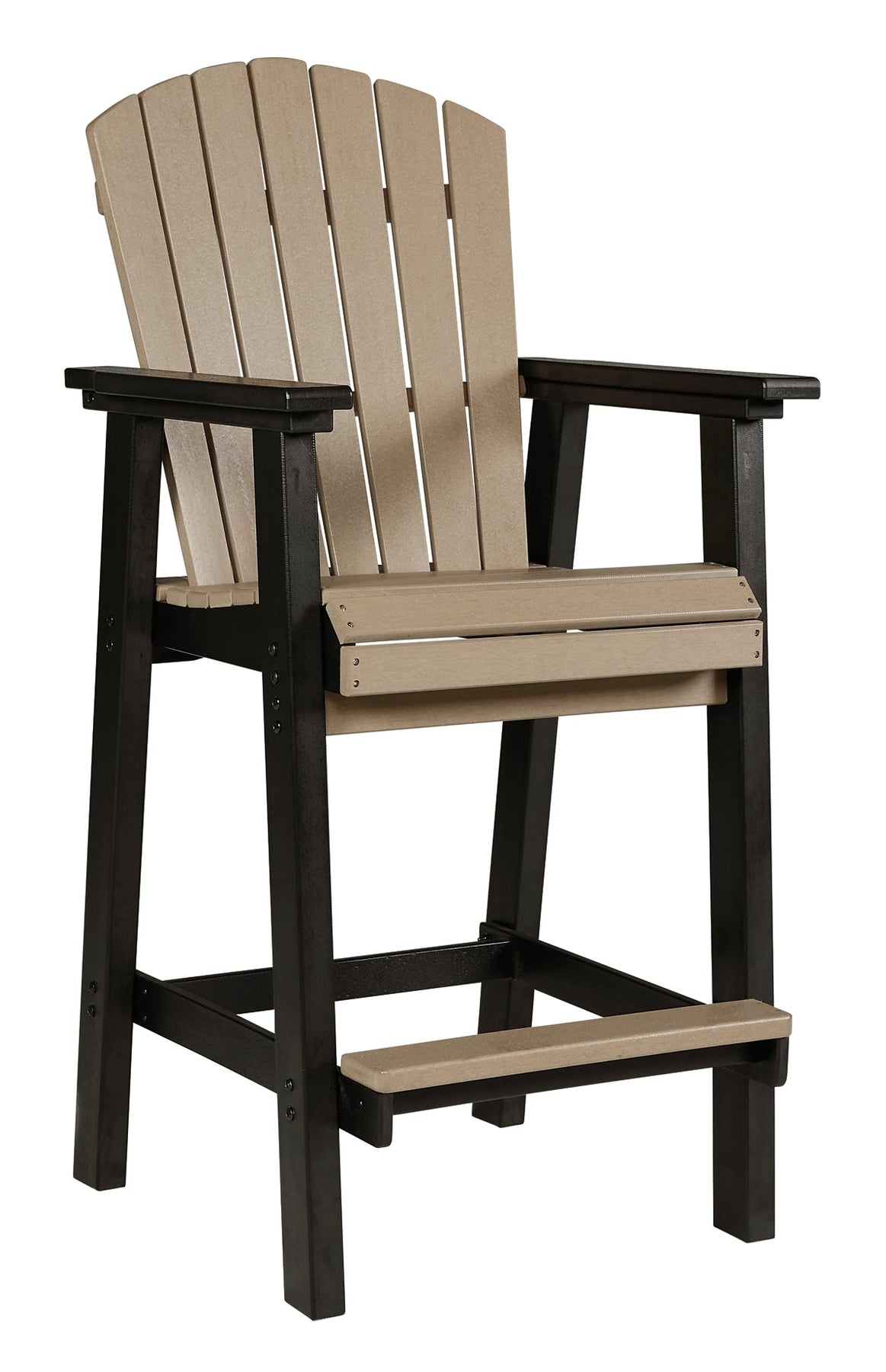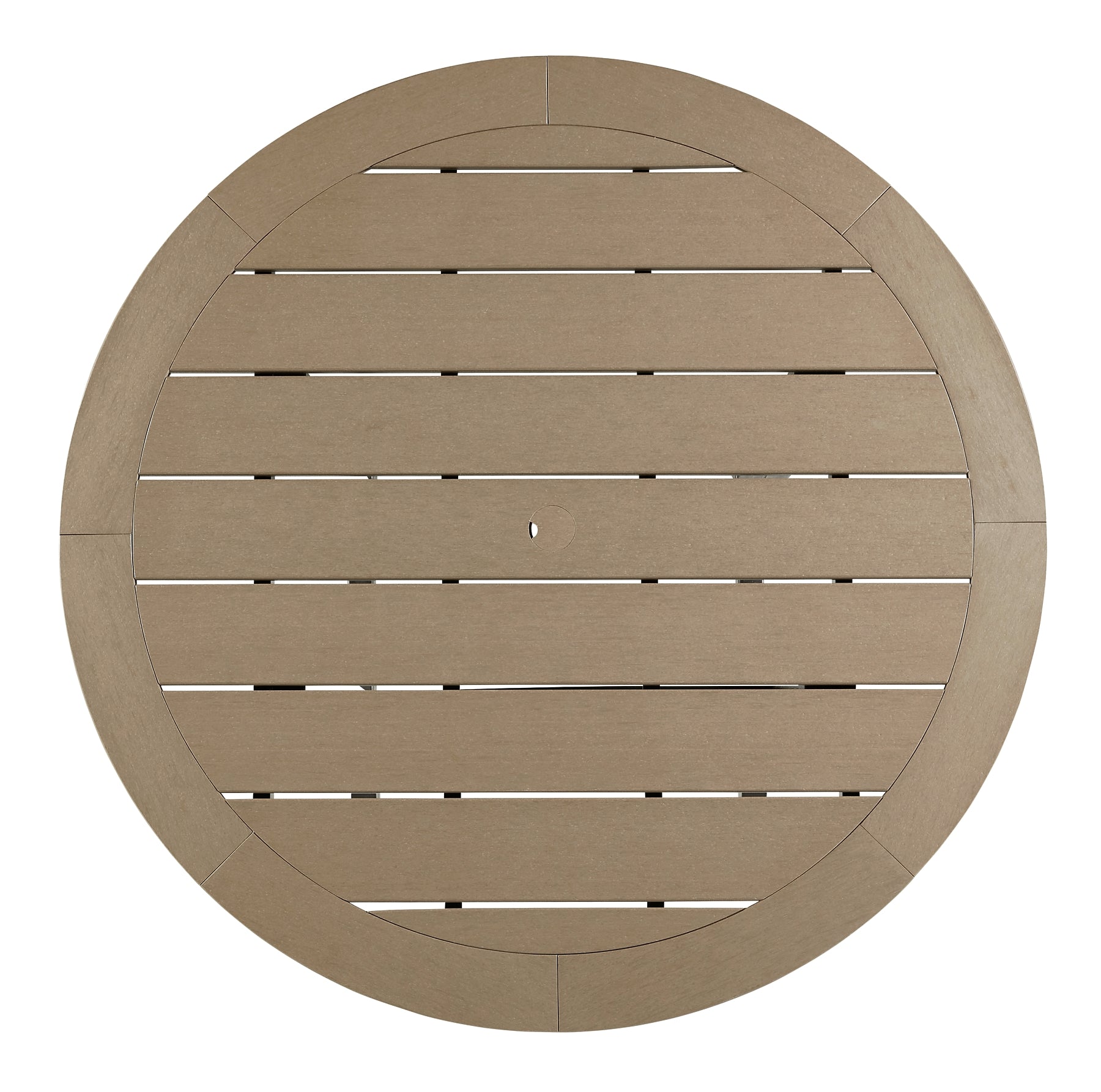 Details Includes rounded bar table and set of 2 bar stools, Table and stool made of durable and sturdy HDPE material, Table and stool designed to withstand the harsh elements of the outdoors, Table and stool with two-tone driftwood-look/black finish, Table with umbrella hole (with cover cap for when not in use), Assembly required