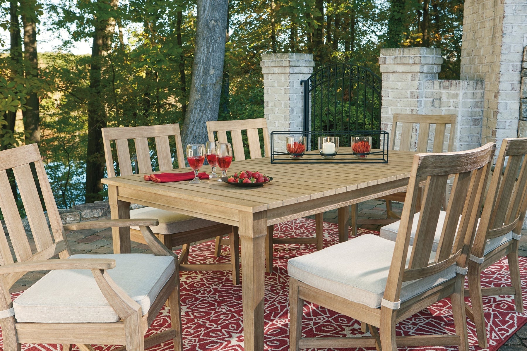 Details Includes dining table, 2 arm chairs with cushions and 4 side chairs with cushions, Made of eucalyptus wood in antiqued teak-look finish, 5-step protective coating process, Table comfortably accommodates 6, Zippered cushions with Velcro® ties covered in high-performing Nuvella® fabric, All-weather foam cushion core wrapped in soft polyester, Chairs feature wood frames with tapered legs and slat styling, Slatted tabletop with umbrella hole; cap included, Clean fabric with mild soap and water, let air dry; for stubborn stains, use a solution of 1 cup bleach to 1 gallon water, Assembly required