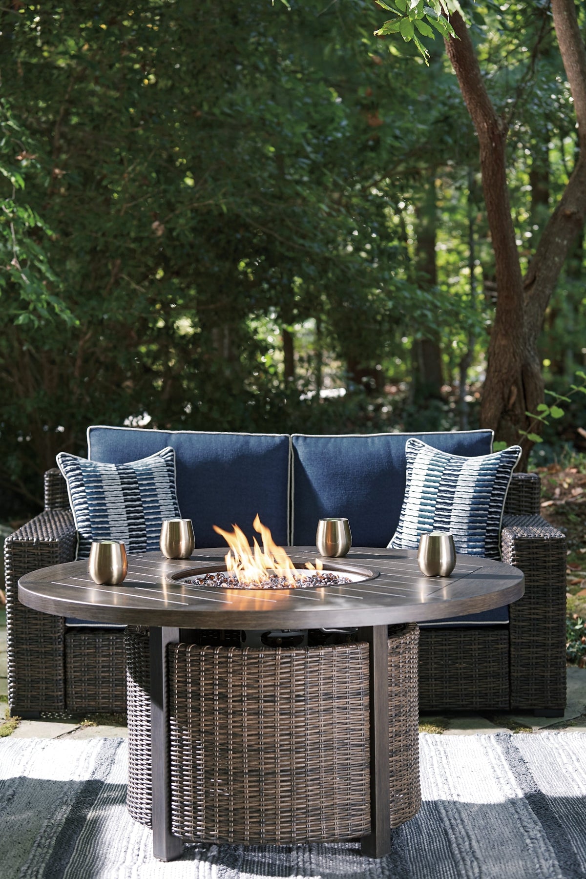 | Details | Includes fire pit table and loveseat with cushion, All-weather resin wicker handwoven over durable aluminum frames, Powder coated aluminum resists rusting and fading, Table with aluminum wood-look top, 48" round fire pit with CSA-approved 55,000 BTU stainless steel burner, glass beads, burner cover and protective all-weather cover, Zippered cushion covered in high-performing Nuvella® fabric, All-weather foam cushion core wrapped in soft polyester, Fire pit table door conceals gas propane tank (not included); convertible to natural gas, Fire pit table features battery-operated ignition system with adjustable flame control; battery included, Imported fabric and fill, Clean fabric with mild soap and water, let air dry; for stubborn stains, use a solution of 1 cup bleach to 1 gallon water, Assembly of fire pit table provided with in-home delivery; connection to propane tank or connector hose not provided, Assembly required | |