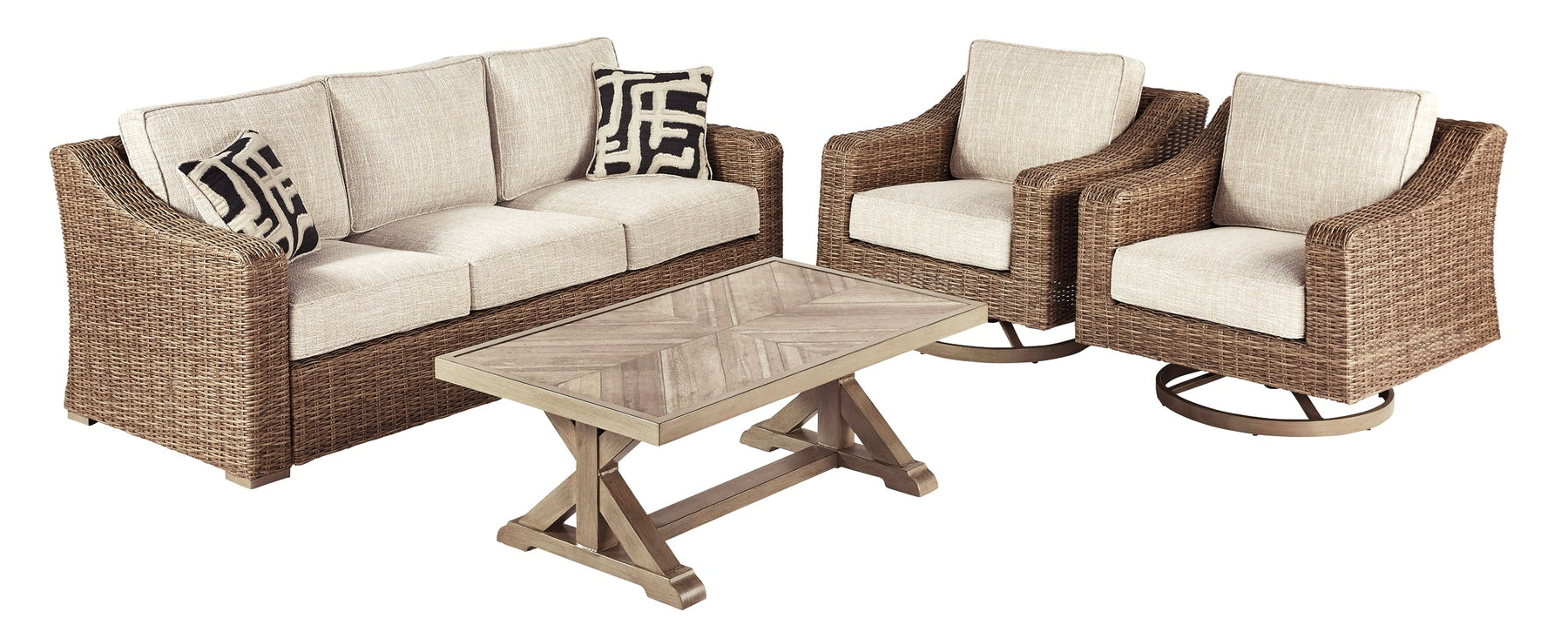 | Details | Includes sofa with cushions, 2 swivel chairs with cushions and coffee table, Table with all-weather, rust-resistant, powder coated aluminum base and porcelain top, Sofa and chairs with all-weather resin wicker handwoven over powder coated rust-proof aluminum frames, 2 throw pillows included, Swivel chairs with 360-degree turning radius, Zippered cushions and throw pillows covered in high-performing Nuvella® fabric, All-weather foam cushion core wrapped in soft polyester, Clean fabric with mild soap and water, let air dry; for stubborn stains, use a solution of 1 cup bleach to 1 gallon water, Imported fabric and fill, Assembly required | |