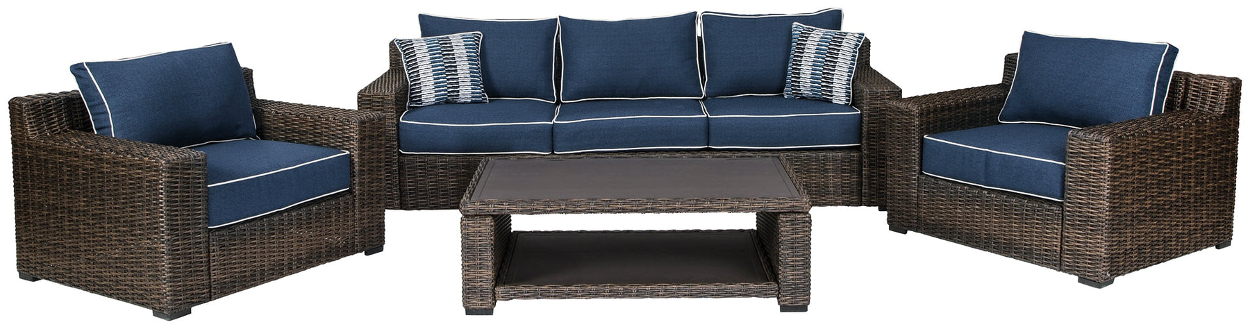 | Details | Includes sofa with cushions, 2 lounge chairs with cushions and coffee table, All-weather resin wicker handwoven over durable aluminum frames, Powder coated aluminum resists rusting and fading, Coffee table with aluminum top and lower shelf, Zippered cushions covered in high-performing Nuvella® fabric, All-weather foam cushion core wrapped in soft polyester, Imported fabric and fill, Clean fabric with mild soap and water, let air dry; for stubborn stains, use a solution of 1 cup bleach to 1 gallon water, Assembly required | |