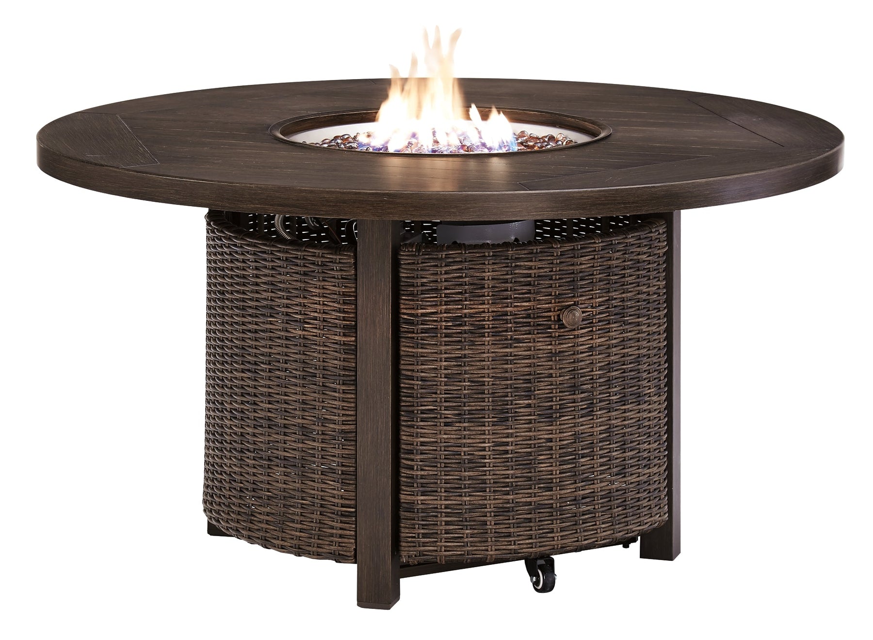 | Details | Includes sofa with cushions, 2 swivel lounge chairs and round fire pit table, All-weather, handwoven resin wicker over rust-free aluminum frame, Wood-like finish on sofa and chair armrests, chair base and fire pit top, 48" round fire pit with CSA-approved 55,000 BTU stainless steel burner, glass beads, burner cover and protective all-weather cover, Seat cushions and pillows covered with high-performance Nuvella® fabric; all-weather foam cushion core wrapped in soft polyester, Fire pit convertible to natural gas; door conceals gas propane tank (not included), Fire pit features battery-operated ignition system with adjustable flame control; battery included, Chair with 360-degree swivel, Clean fabric with mild soap and water, let air dry; for stubborn stains, use a solution of 1 cup bleach to 1 gallon water, Throw pillows included, Imported fabric and fill, Assembly of fire pit table provided with in-home delivery; connection to propane tank or connector hose not provided, Assembly required | |
