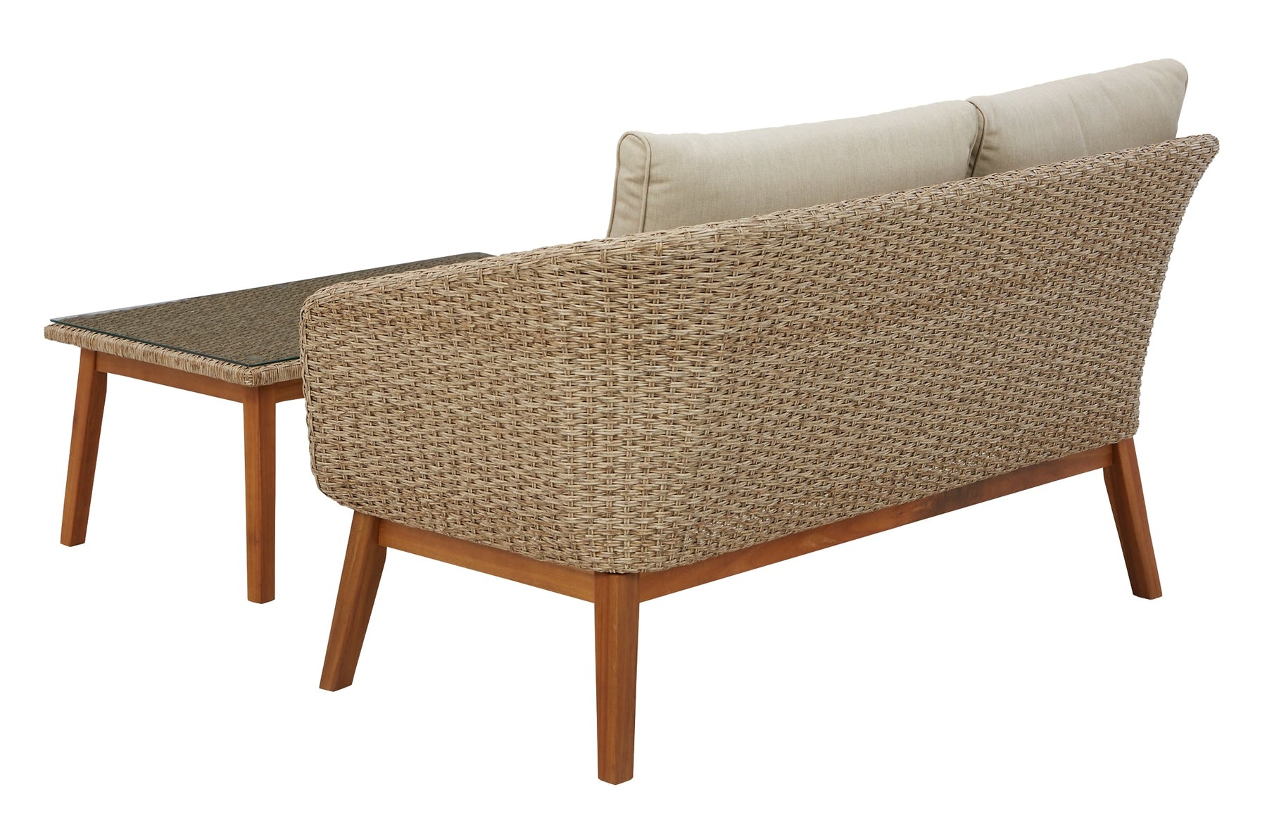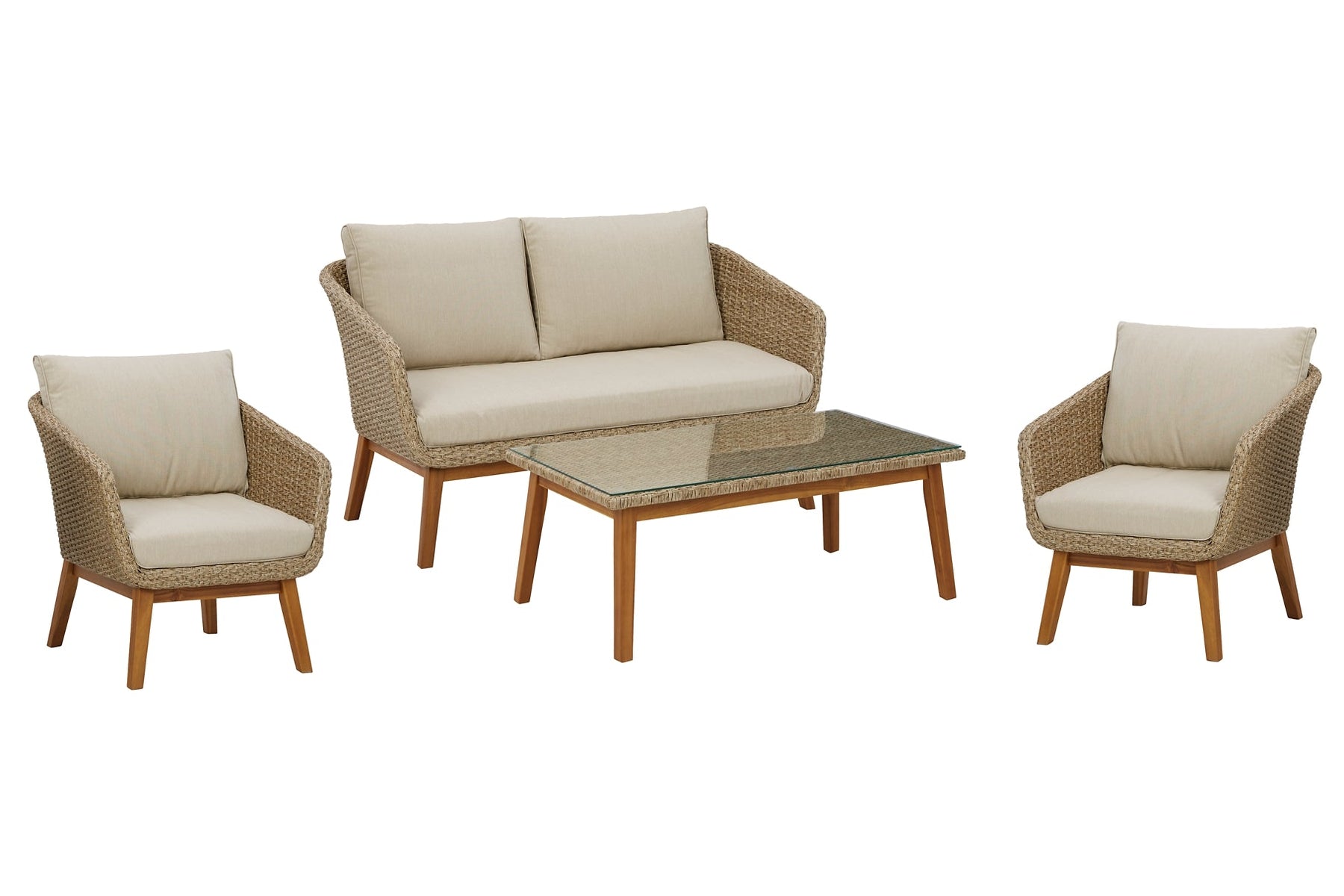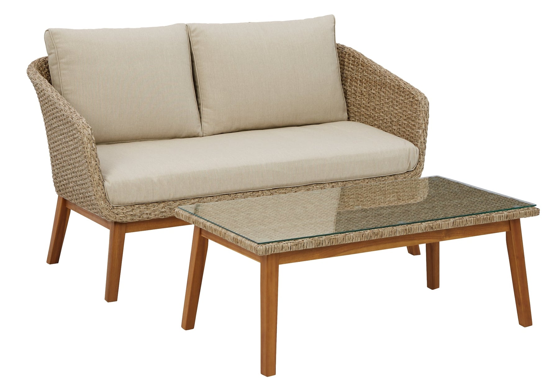 | Details | Includes 2 lounge chairs, loveseat and outdoor coffee table, Made with resin wicker woven over aluminum frame, Table with tempered glass top, Acacia wood legs, Cushions covered in solution-dyed Nuvella® (olefin) high-performance fabric, All-weather foam cushion core wrapped in soft polyester, Clean fabric with mild soap and water, let air dry; for stubborn stains, use a solution of 1 cup bleach to 1 gallon water, Imported fabric and fill, Assembly required | |