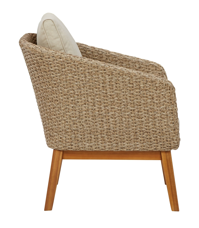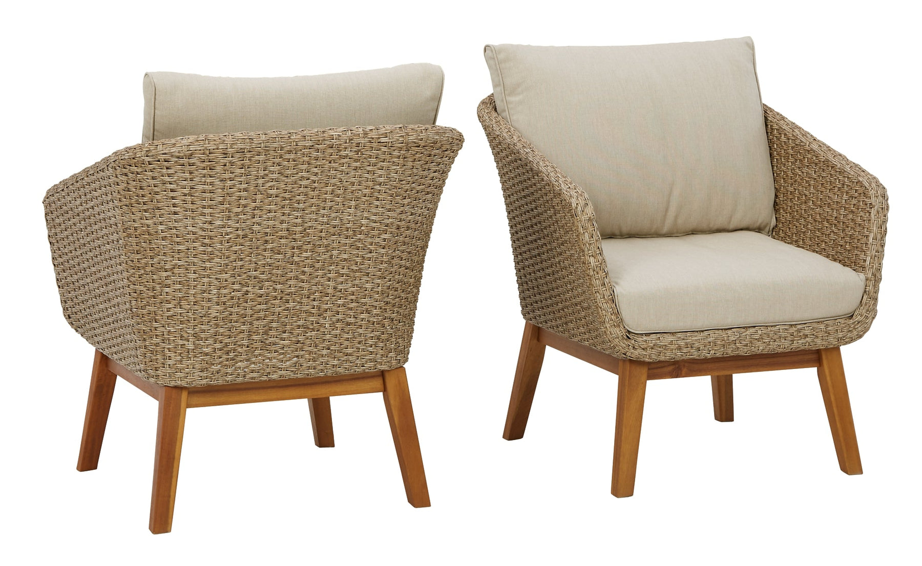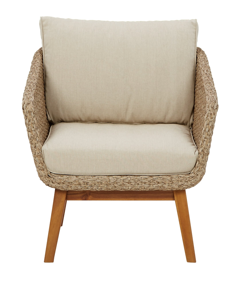 | Details | Includes 2 lounge chairs, loveseat and outdoor coffee table, Made with resin wicker woven over aluminum frame, Table with tempered glass top, Acacia wood legs, Cushions covered in solution-dyed Nuvella® (olefin) high-performance fabric, All-weather foam cushion core wrapped in soft polyester, Clean fabric with mild soap and water, let air dry; for stubborn stains, use a solution of 1 cup bleach to 1 gallon water, Imported fabric and fill, Assembly required | |