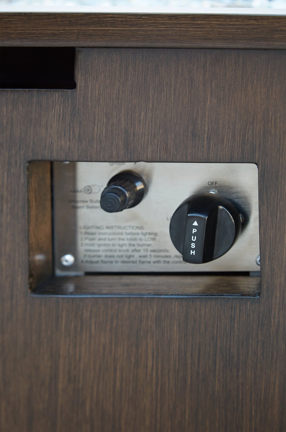 Details Rectangular gas fire pit table with CSA-approved 47,000 BTU burner, glass beads, burner cover and all-weather polyester cover, Rust-resistant aluminum frame, Hand-applied multi-step paint finish, Stainless steel hardware, Battery-operated ignition system with adjustable flame control; battery included, Side door conceals gas propane tank (not included), Convertible to natural gas, Designed to withstand the harsh elements of the outdoors, No assembly required