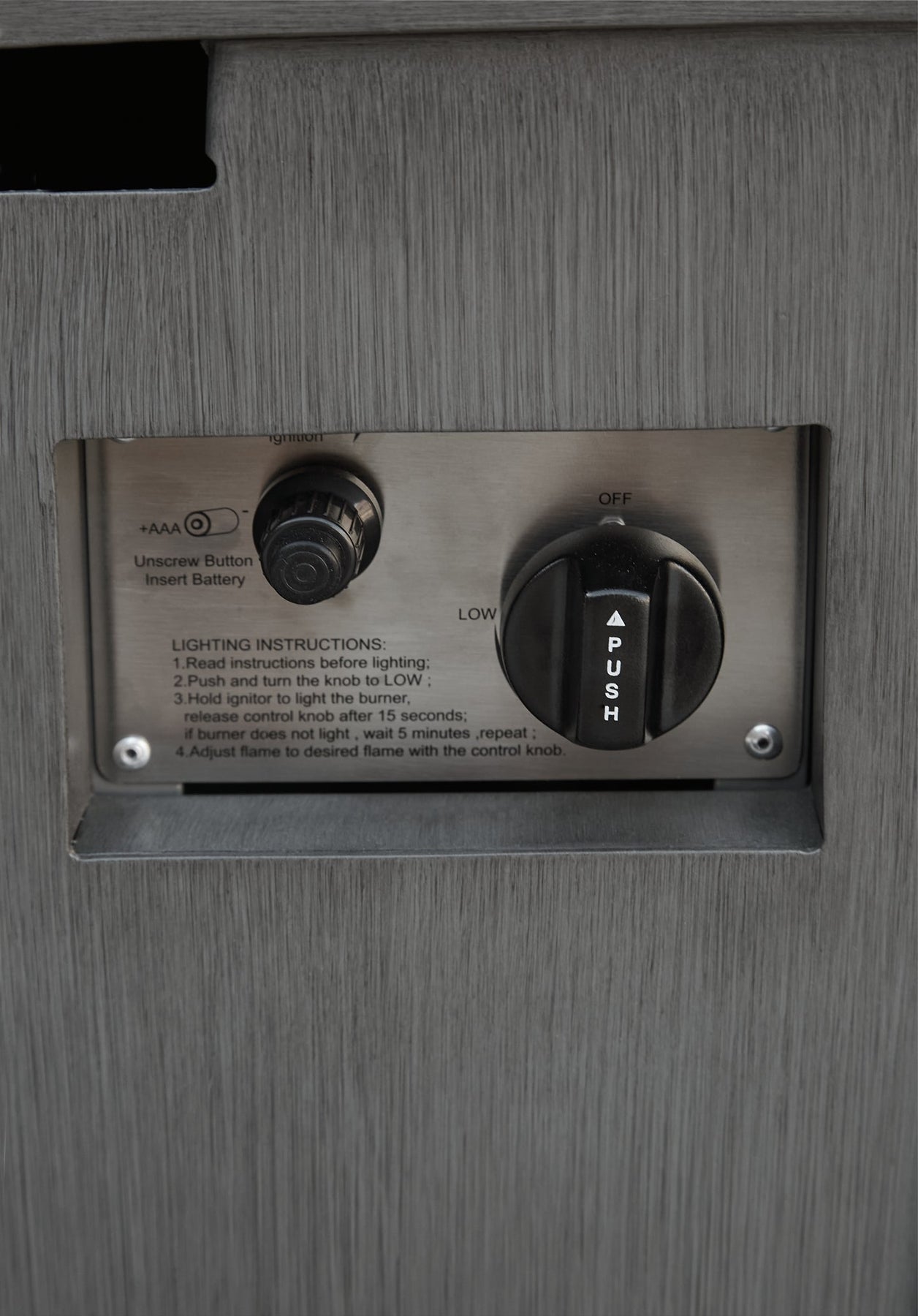 | Details | Rectangular gas fire pit table with CSA-approved 47,000 BTU burner, glass beads, burner cover and all-weather polyester cover, Rust-resistant aluminum frame, Hand-applied multi-step paint finish, Stainless steel hardware, Battery-operated ignition system with adjustable flame control; battery included, Side door conceals gas propane tank (not included), Convertible to natural gas, Designed to withstand the harsh elements of the outdoors, No assembly required | |
