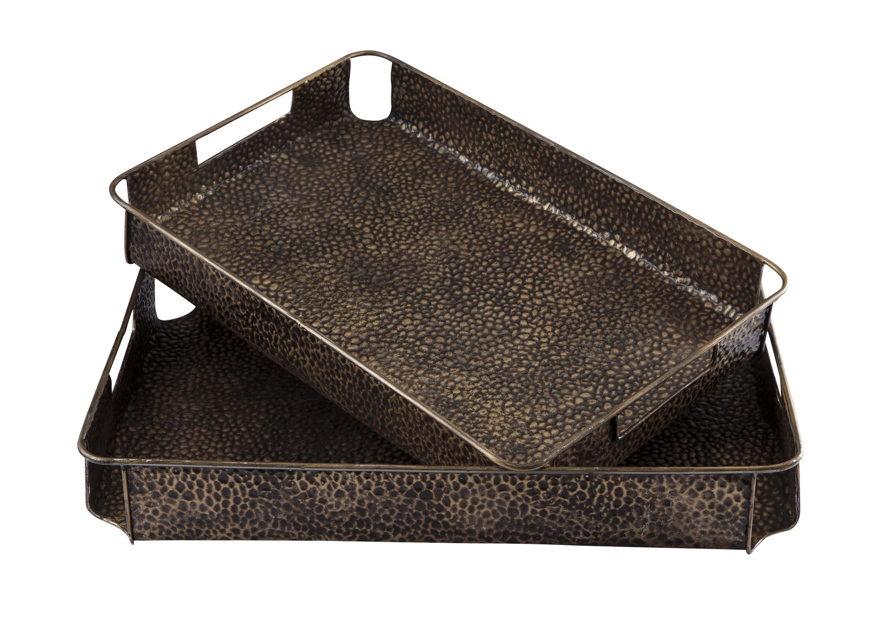 Have a taste for industrial chic? Serve it up in style with the Kale serving trays. Finished in an antiqued bronze tone, the pitted metal charms with posh patina. Corner cutouts incorporate a modern element.