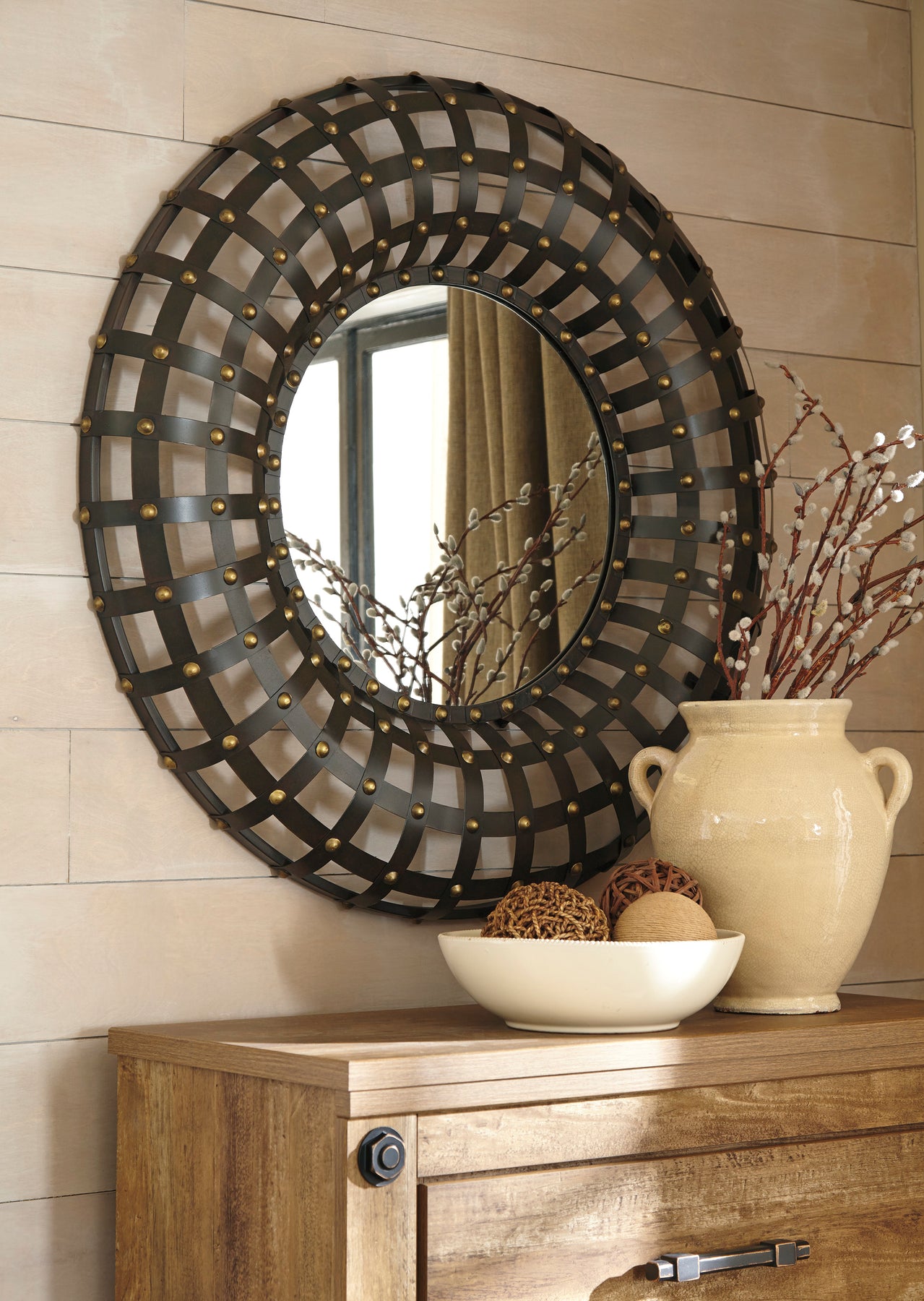 On the grid. Ogier mirror is a cool reflection of modern industrial design. Accentuated with goldtone nailhead trim, the frame’s convex grid design nails the look with curvaceous refinement.