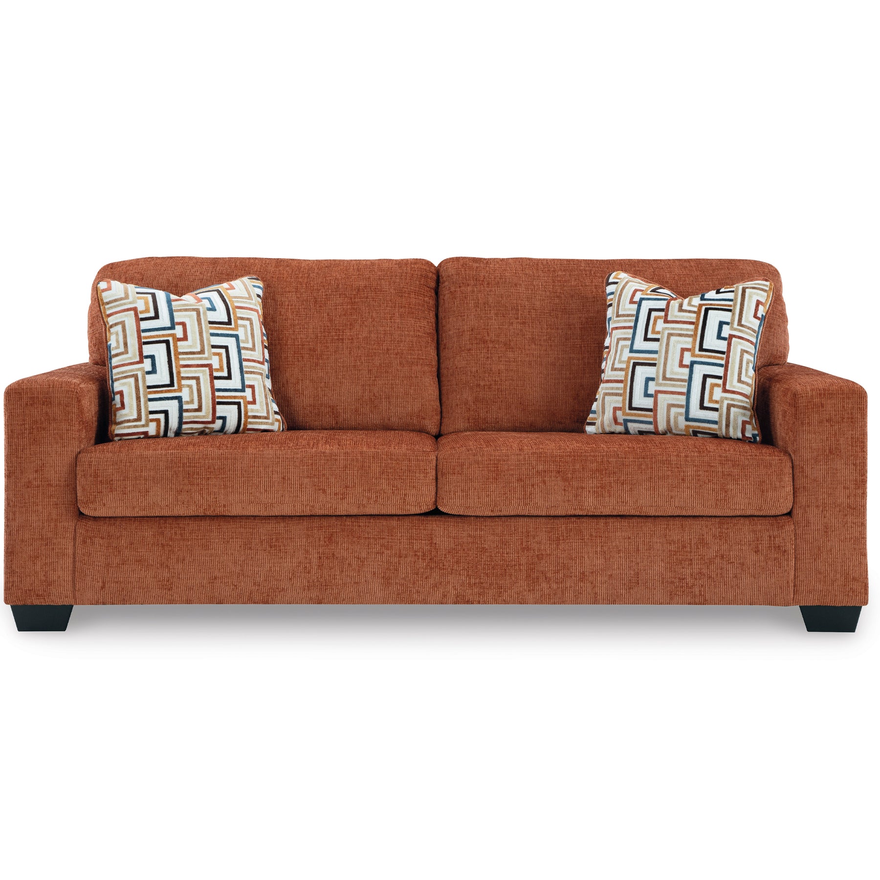 Details Corner-blocked frame, Attached back and loose seat cushions, High-resiliency foam cushions wrapped in thick poly fiber, Accent pillows included, Pillows with soft polyfill, Polyester upholstery, Exposed feet with faux wood finish, Included bi-fold queen memory foam mattress sits atop a supportive steel frame, Memory foam provides better airflow for a cooler night’s sleep, Memory foam encased in damask ticking
